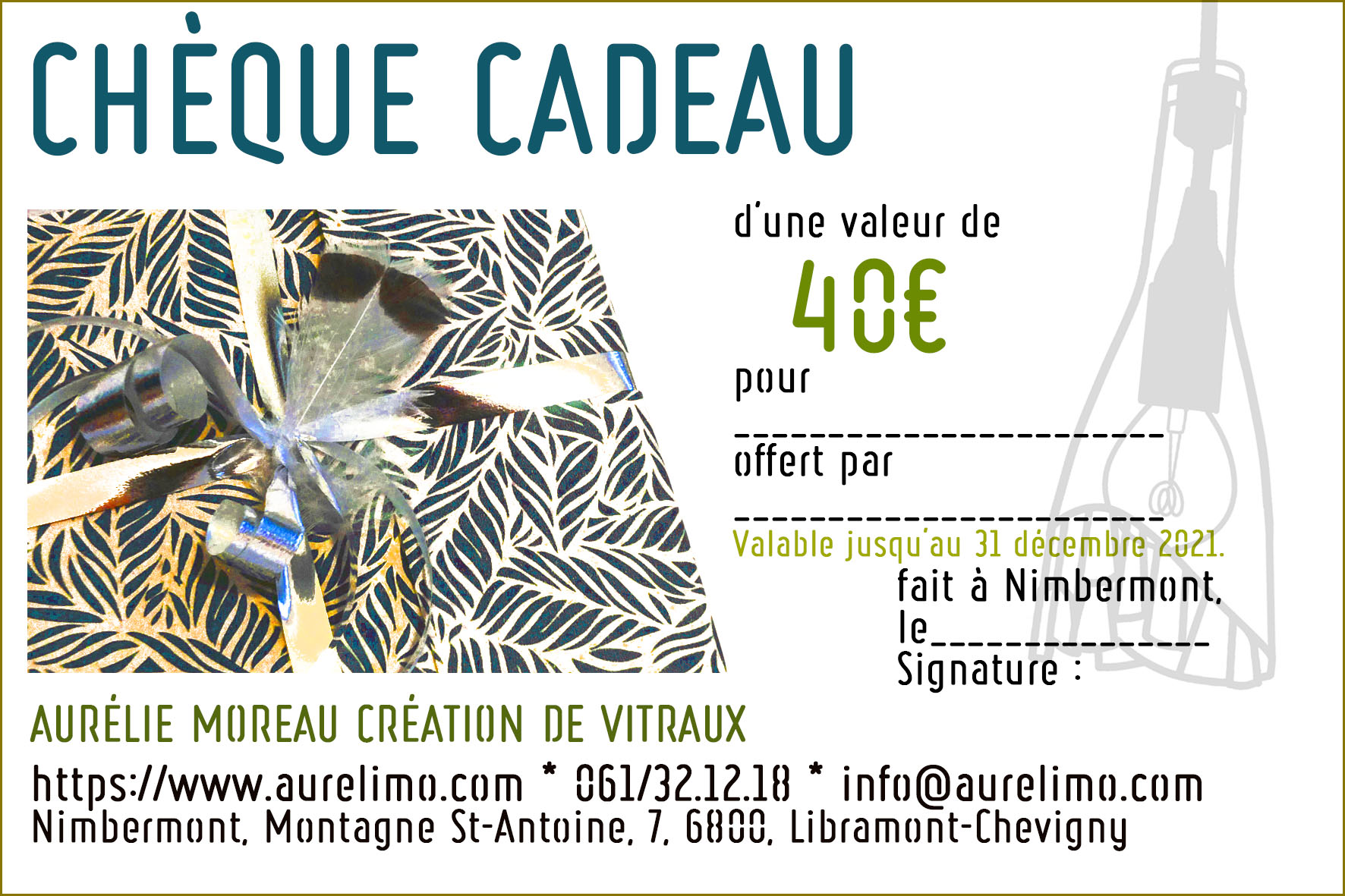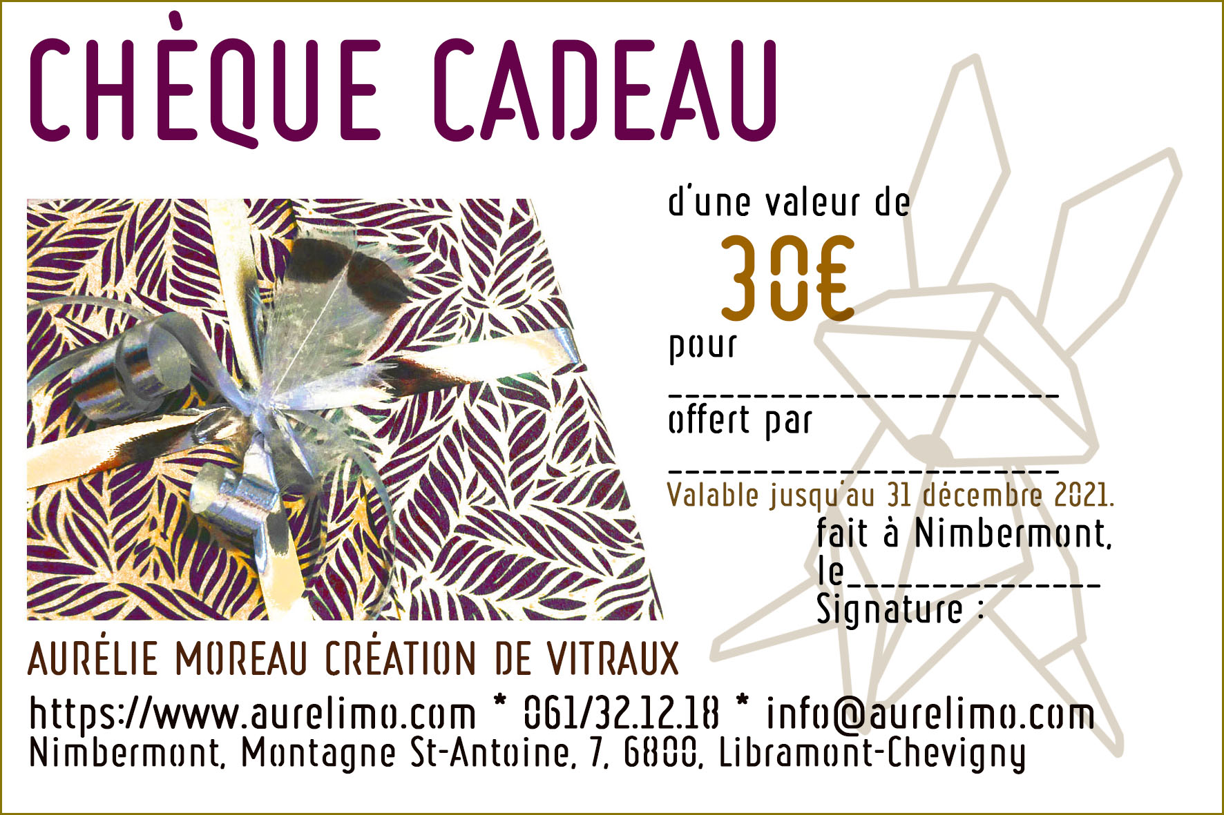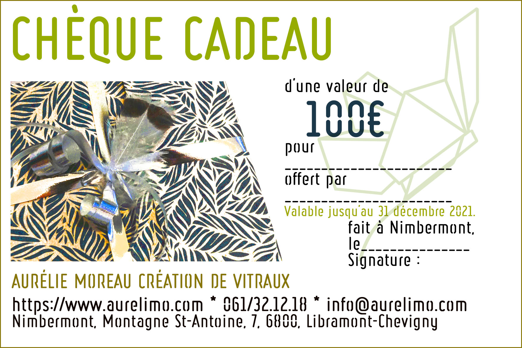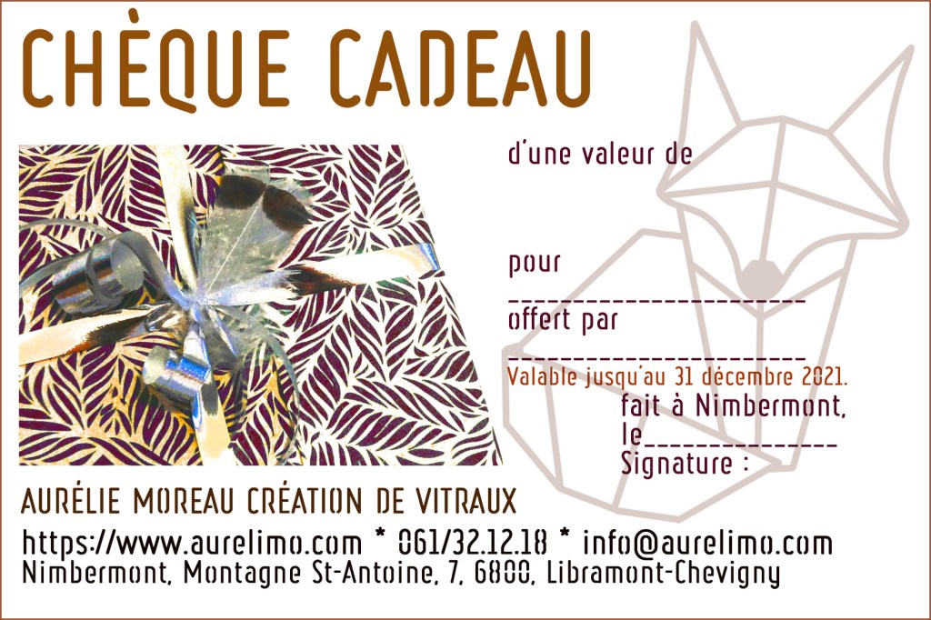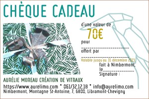 Chèques valables uniquement signés, sur l’ensemble des modèles disponibles. Ils peuvent également être utilisés pour une création personnalisée à convenir avec le bénéficiaire. A venir retirer directement à l’atelier sur rendez-vous, en semaine entre 10h30 et 17h. Possibilité d’envoi par la poste.