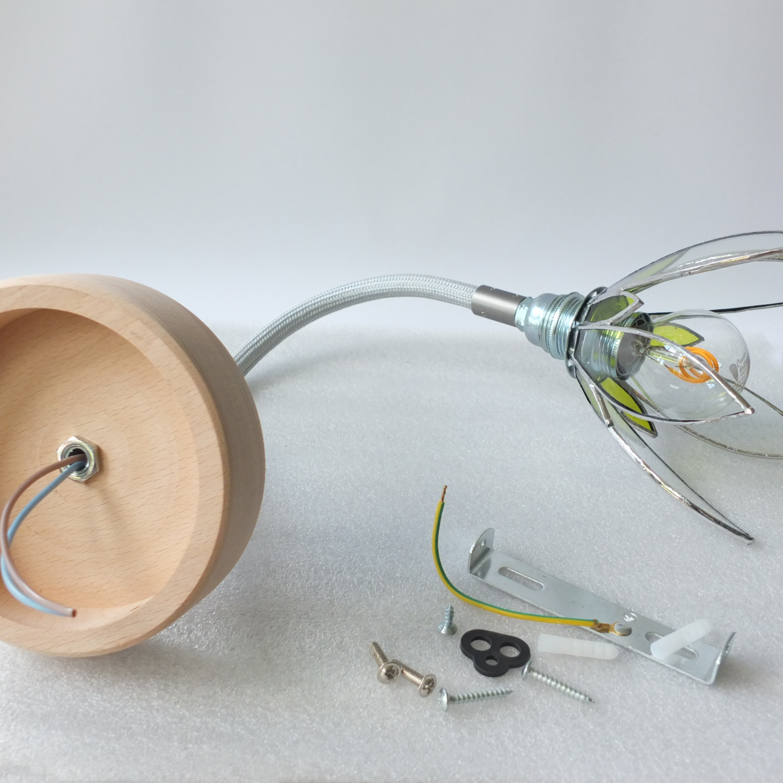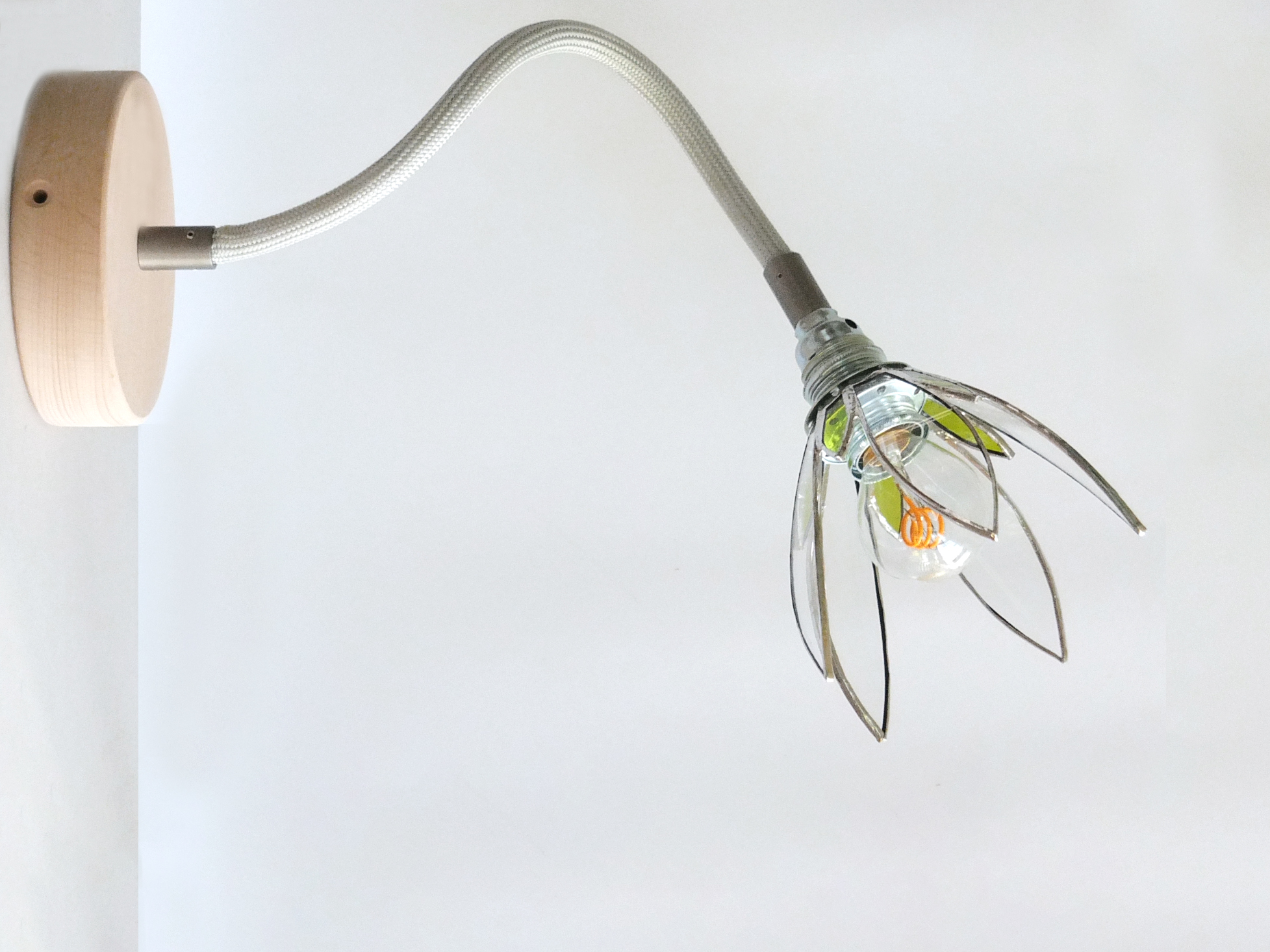 Petit abat-jour en forme de fleur, en verre bombé, montée sur un câble épais, rigide et flexible, argenté. Ce modèle convient pour un éclairage d’ambiance. Il est muni d’une rosace en bois naturel et d’une douille argentée (soquet E14). Il doit être fixé de préférence à l’aide de vis selon le système fourni.