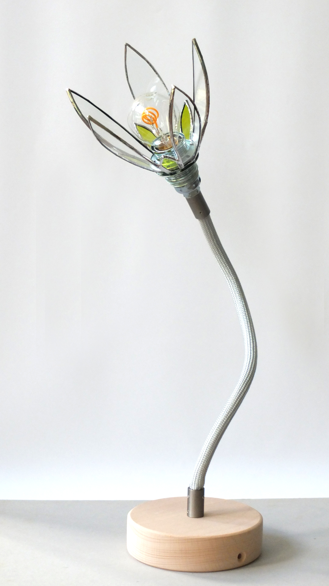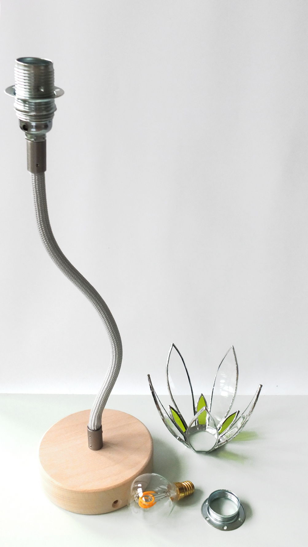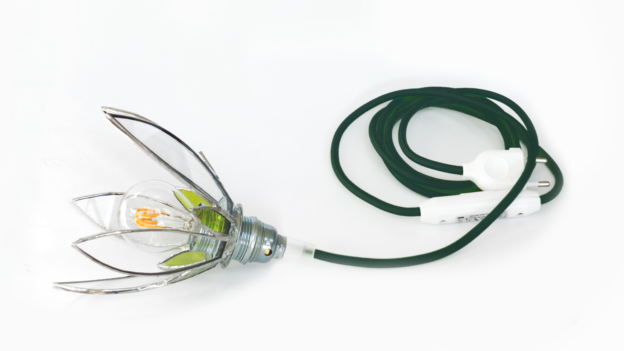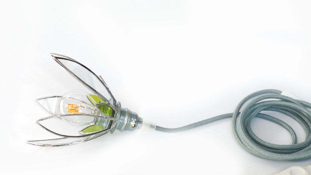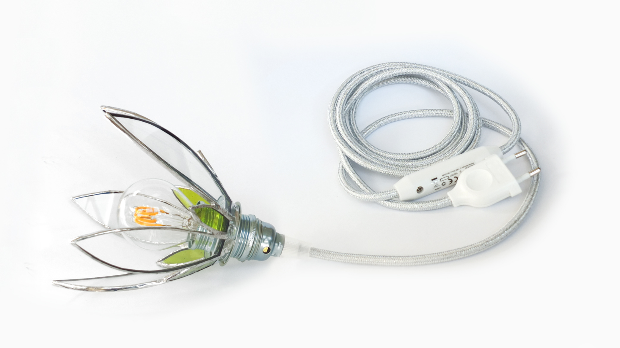 Sur commande, ampoule comprise, douille argentée, soquet E14, douille argentée, fil 1,80m avec fiche et interrupteur – 115€ TTC (2 à 4 semaines, retrait à l’atelier)