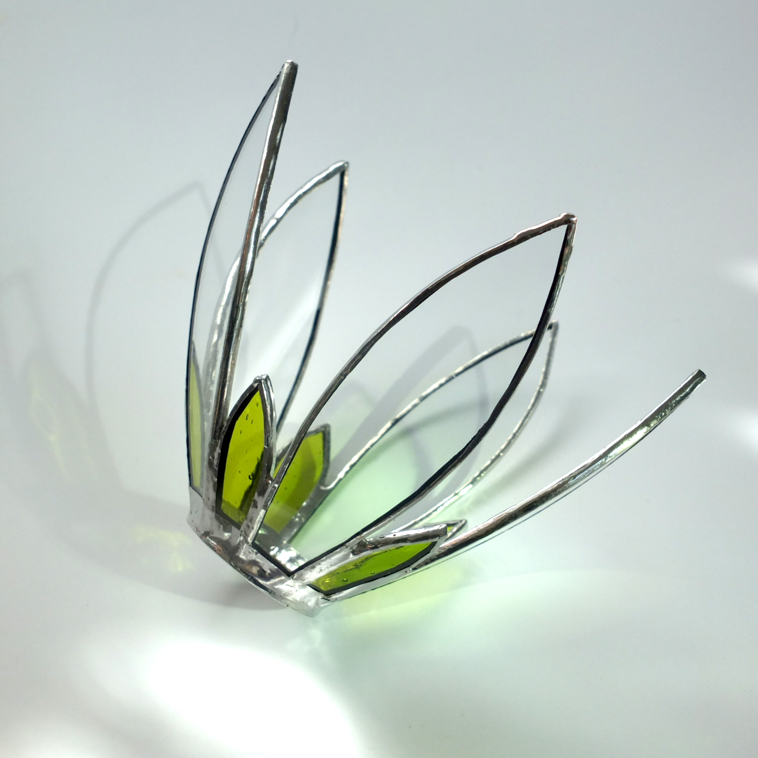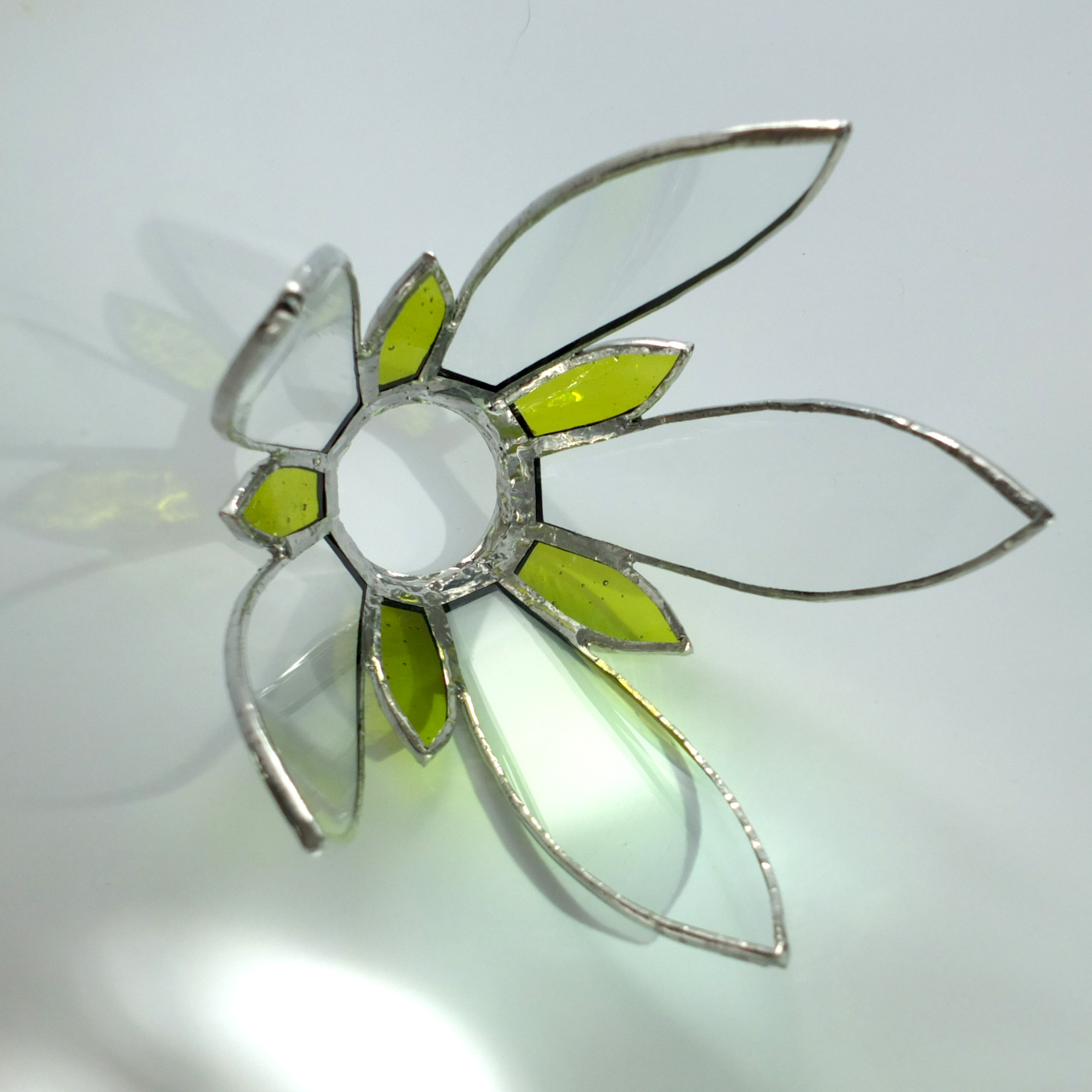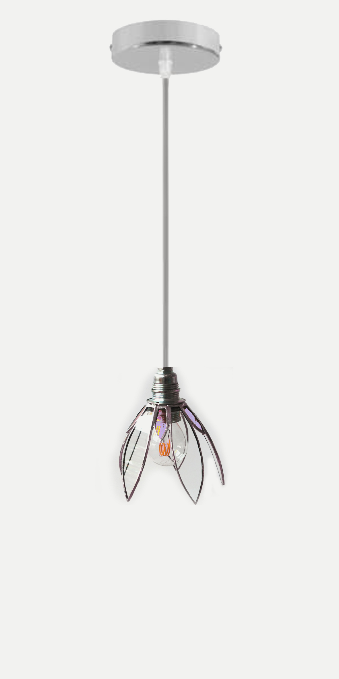L’abat-jour fleur peut être monté en suspension, à un, deux, trois fils ou plus. La rosace argentée existe aussi en blanc ou noir. Attention, le modèle actuel est prévu pour un soquet de type E14, ce qui convient pour une éclairage d’ambiance. Veuillez me consulter si vous seriez intéressé(e) par un abat-jour adapté pour un soquet E27.