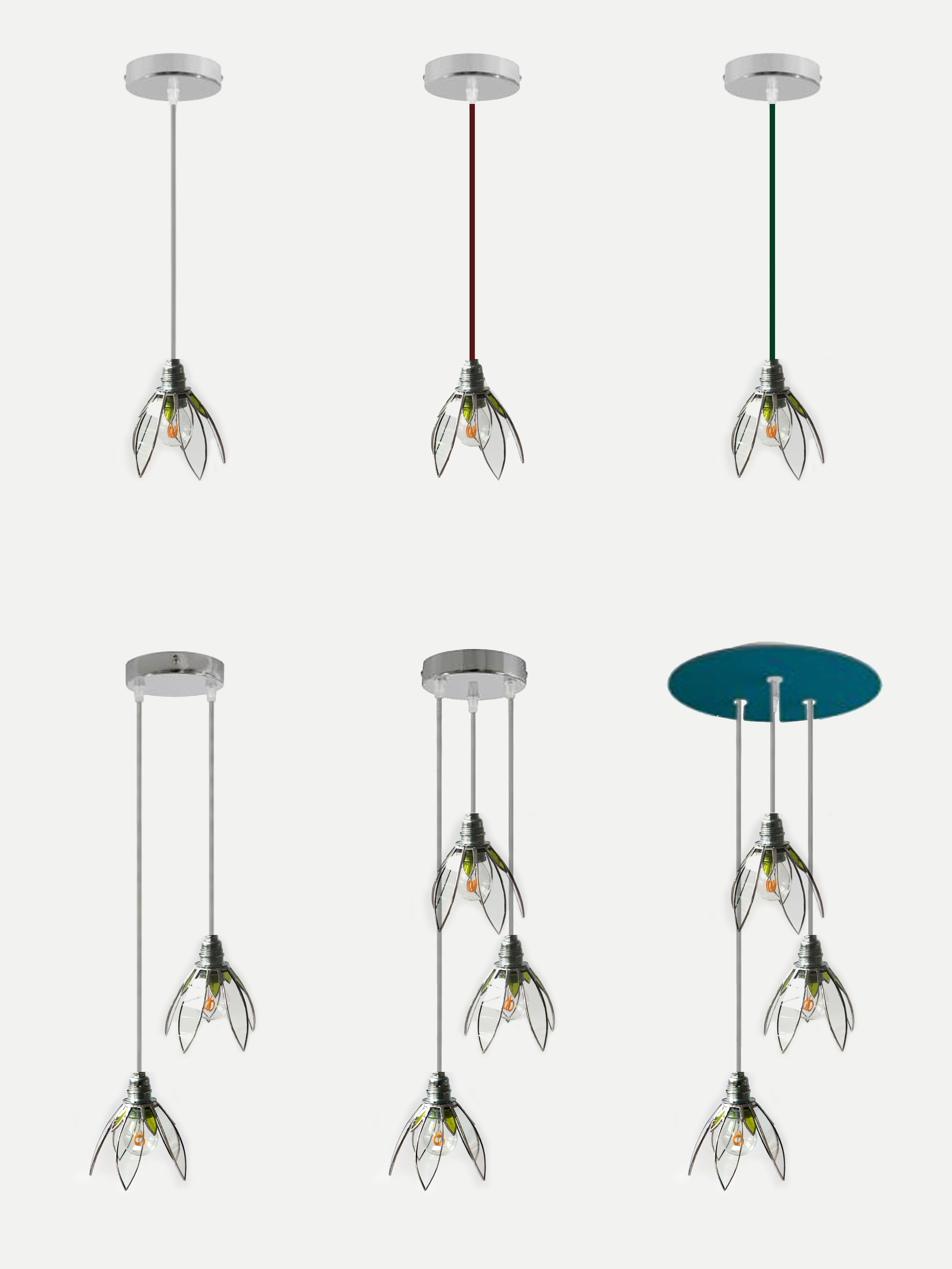 Suspension à 1, 2, 3 fleurs ou plus, douille argentée, soquet E14, ampoule(s) comprise(s), longueur de fil adaptable (jusque 1m inclus), couleur de fleur et de fil au choix.