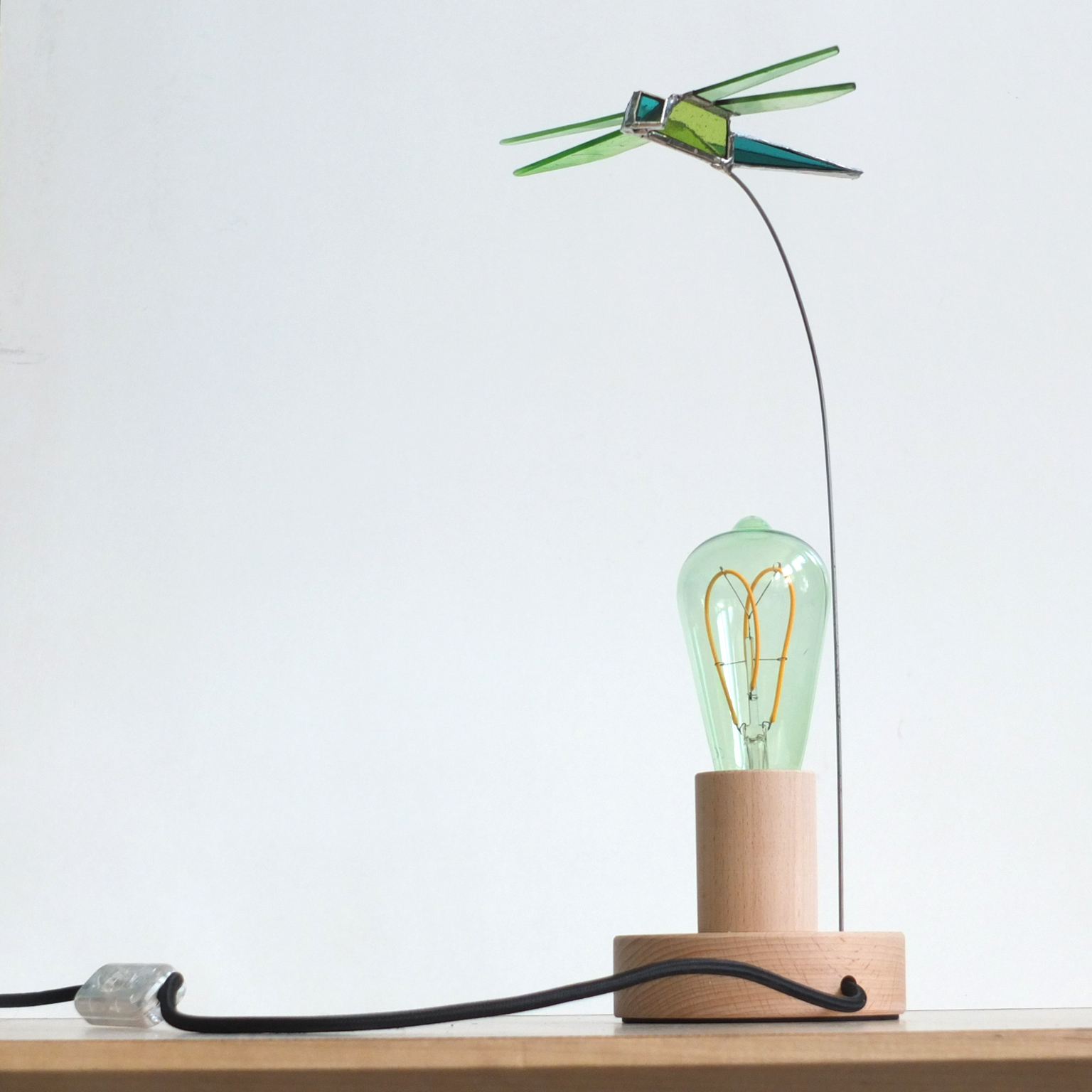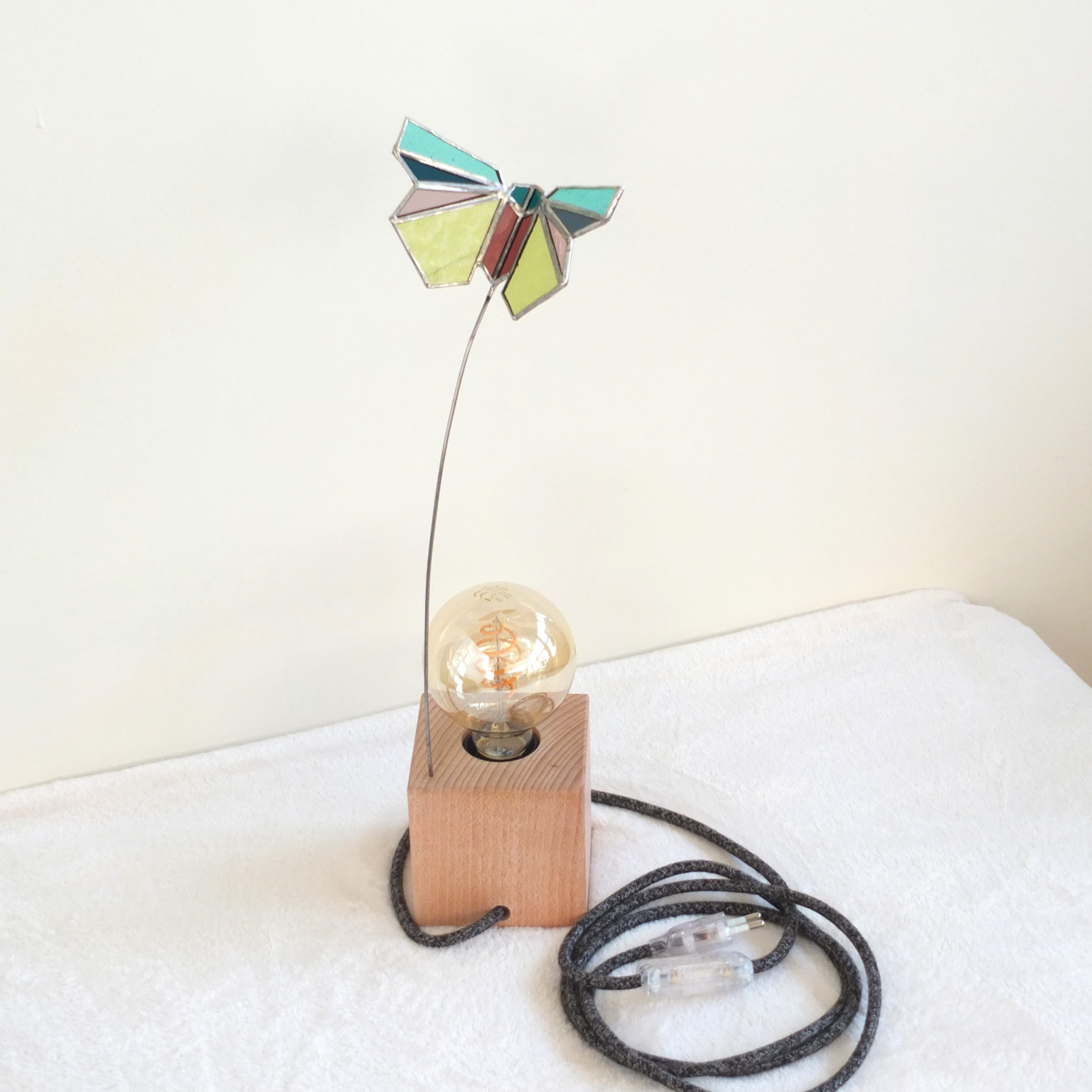 Lampe à poser. Papillon de verre multicolore. Cube en hêtre, fil avec interrupteur gris chiné. Ampoule led. Hauteur 43cm.