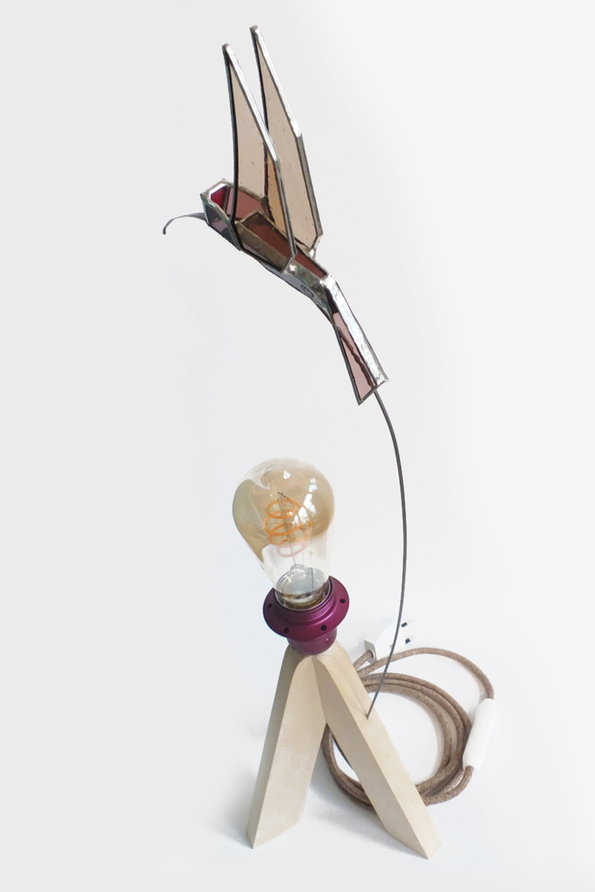 Lampe à poser, ornée d’un colibri de verre dans les tons beige-rose. Socle en bois (résineux), ciré, douille métallique rose foncé mat, fil avec interrupteur chiné cuivré (+/-1,5m). Ampoule led inclue au choix (blanche ou dorée, longue ou ronde). Hauteur totale : 62cm.