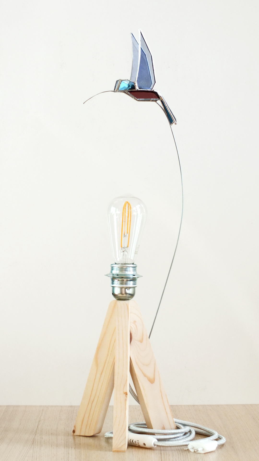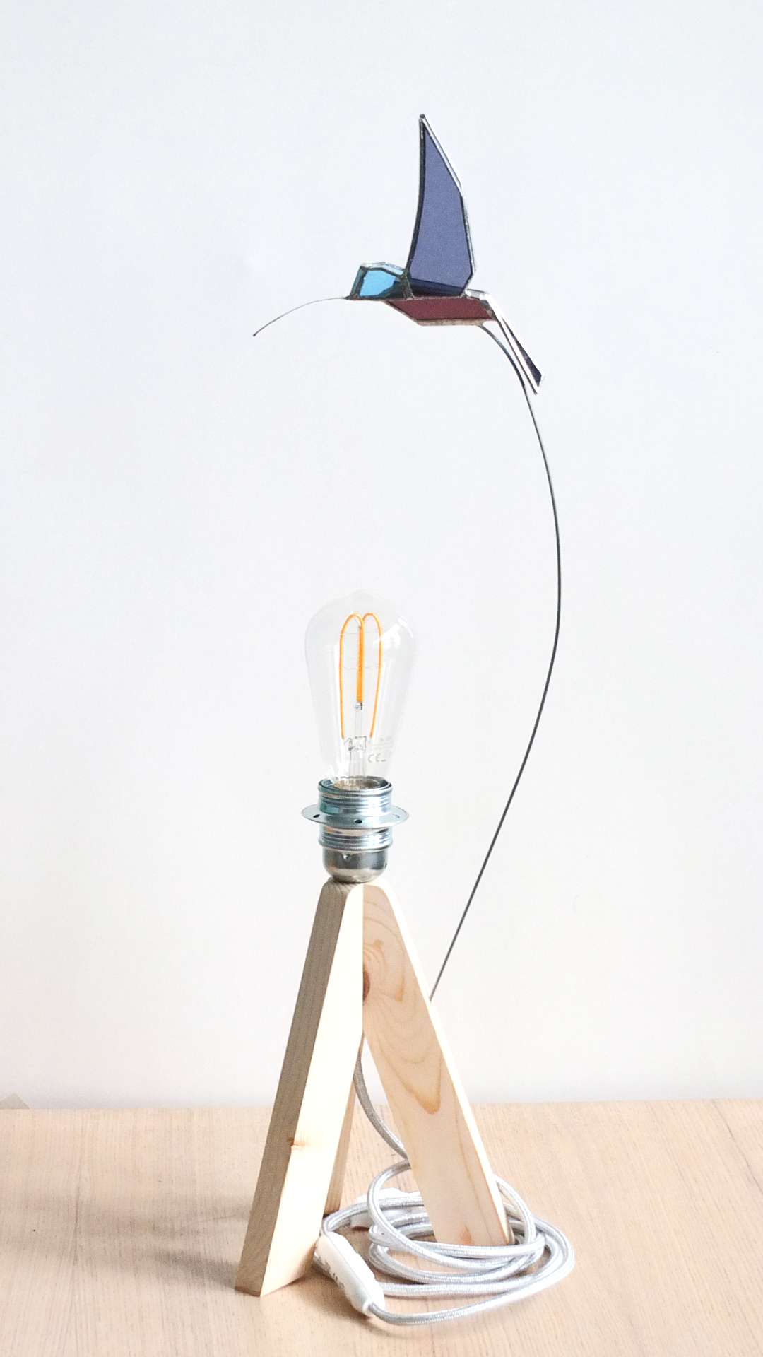 Lampe à poser, ornée d’un colibri de verre dans les tons bleu-mauve. Socle en bois (résineux), ciré, douille métallique argentée, fil avec interrupteur argenté, brillant(+/-1,5m). Ampoule led inclue (blanche). Hauteur totale : 62cm.