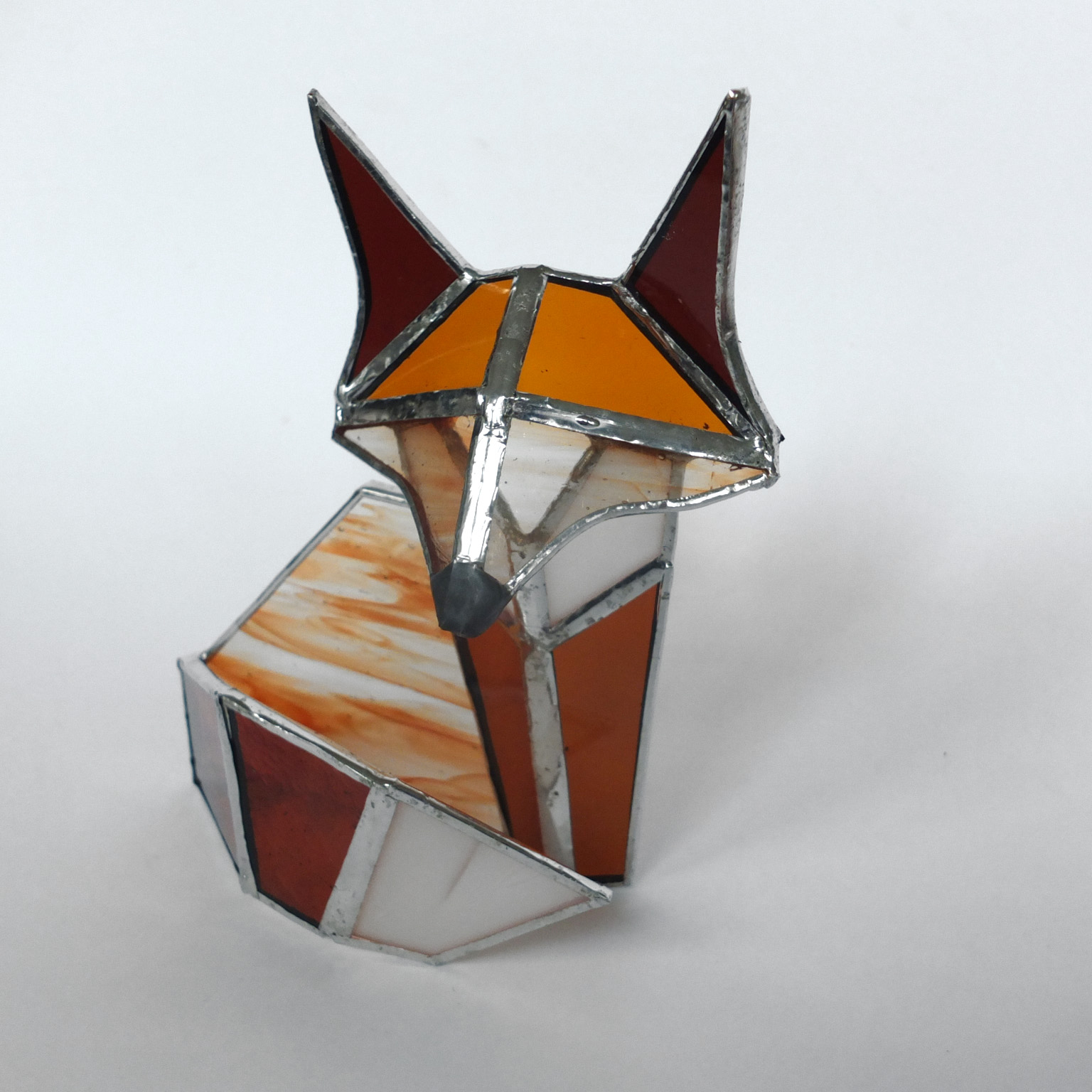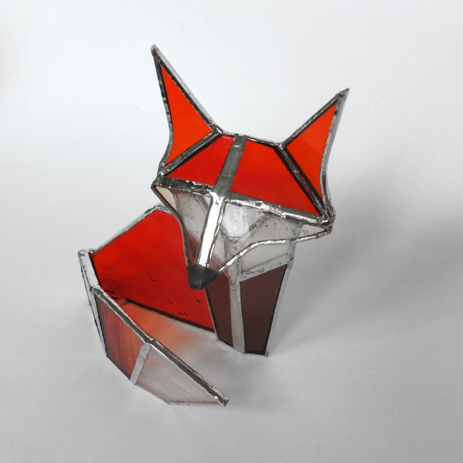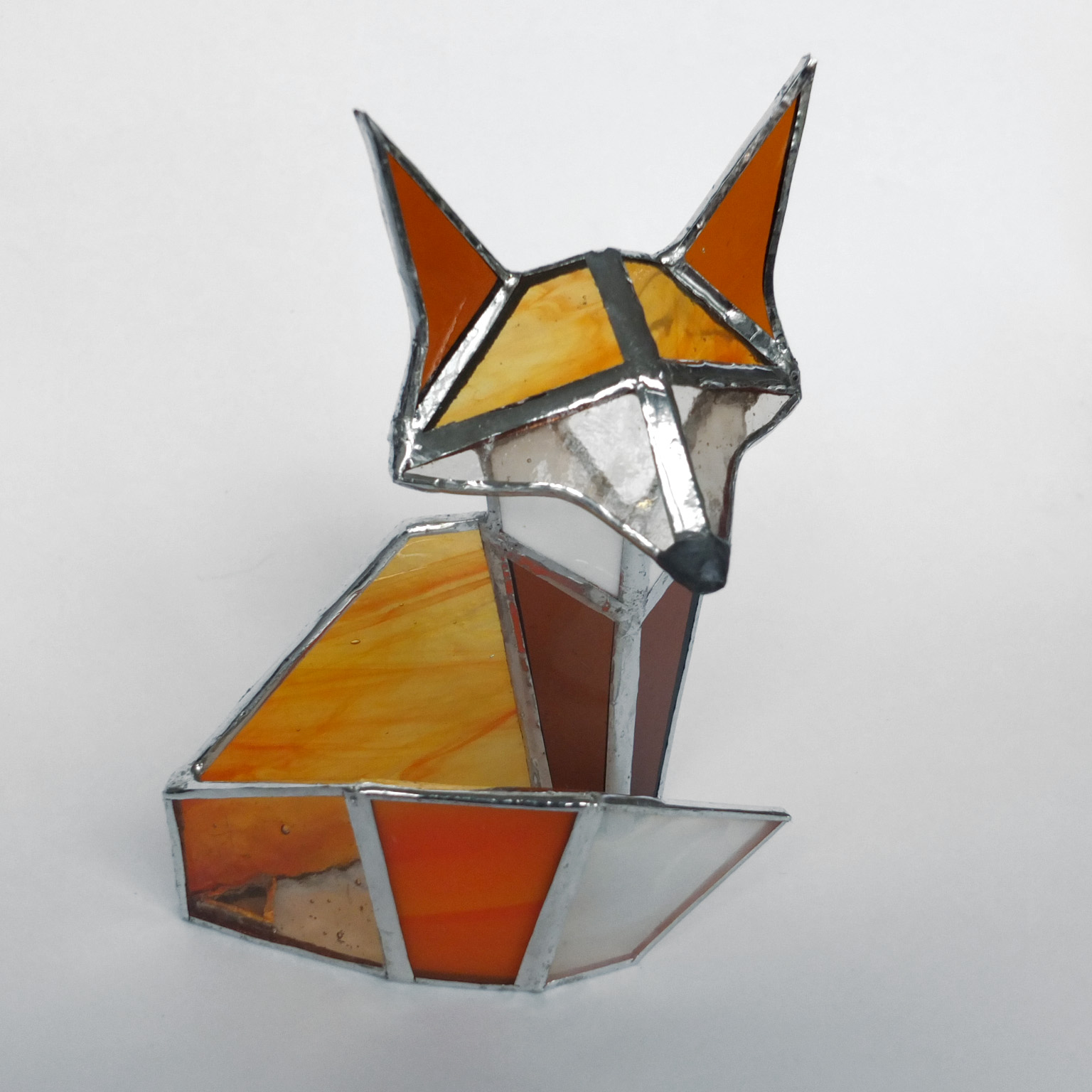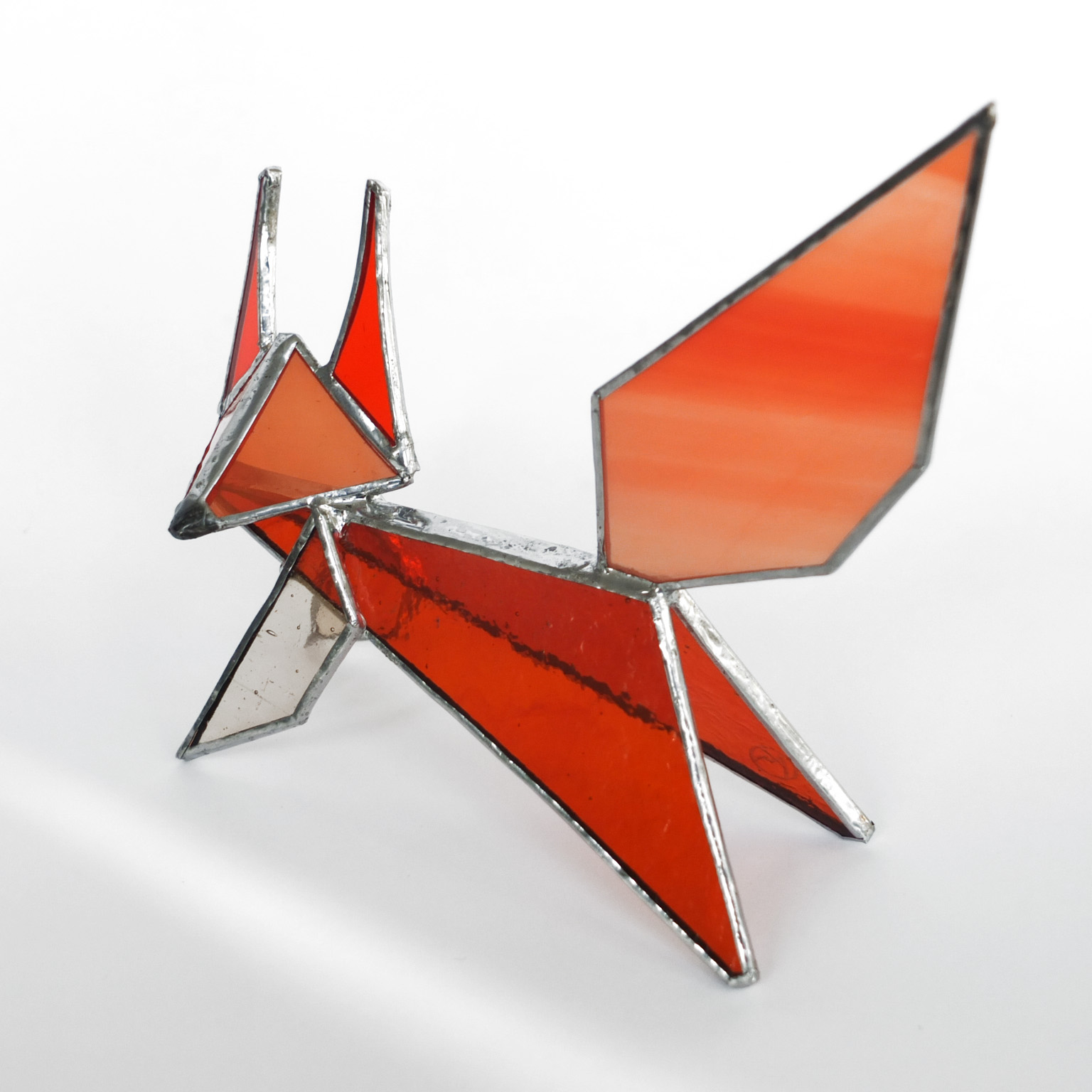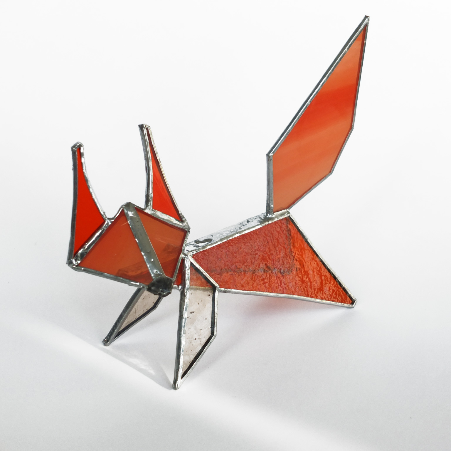 Renard de verre dans des tons oranges, aux oreilles rousses.