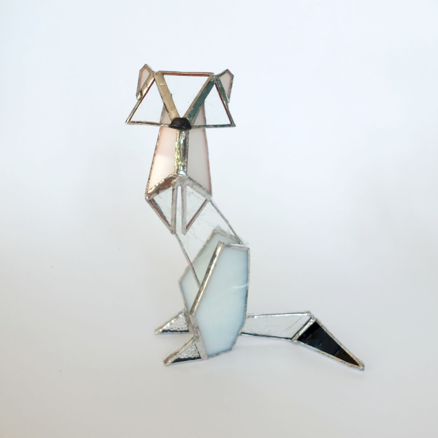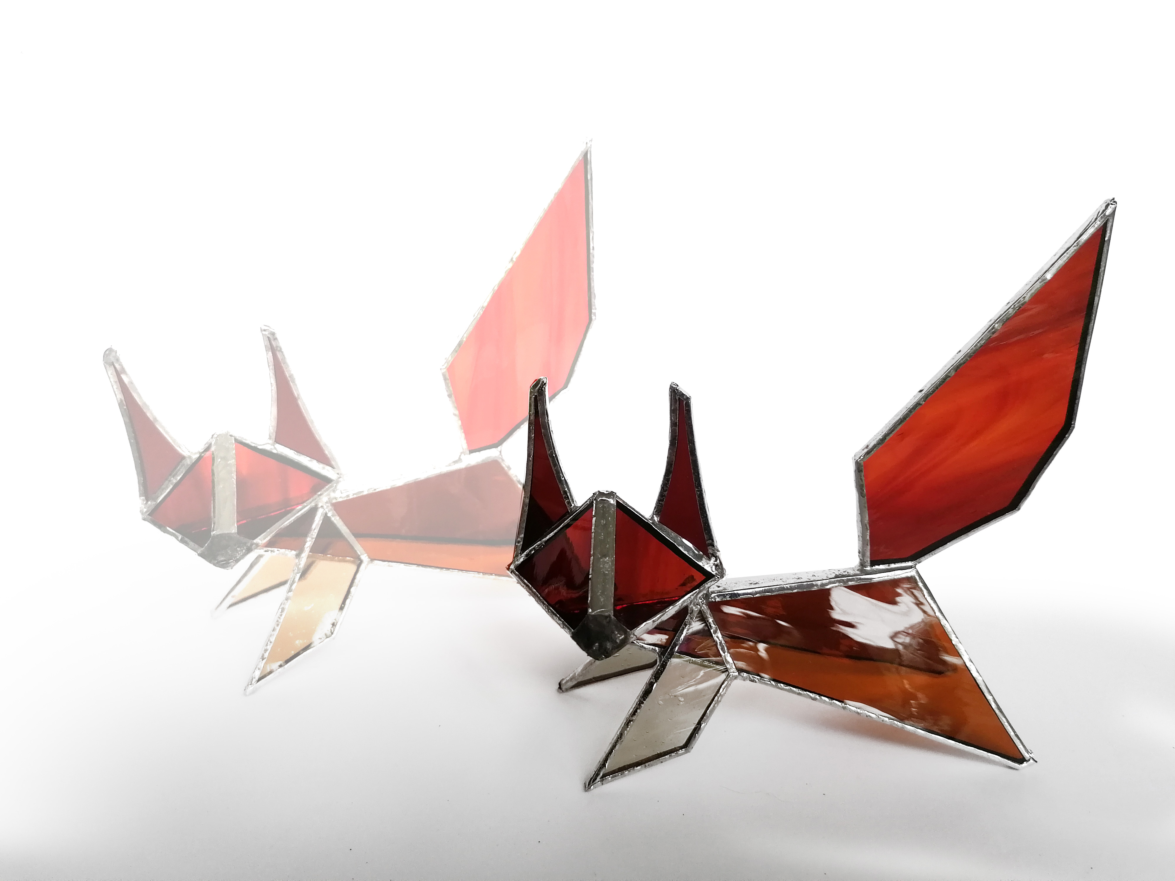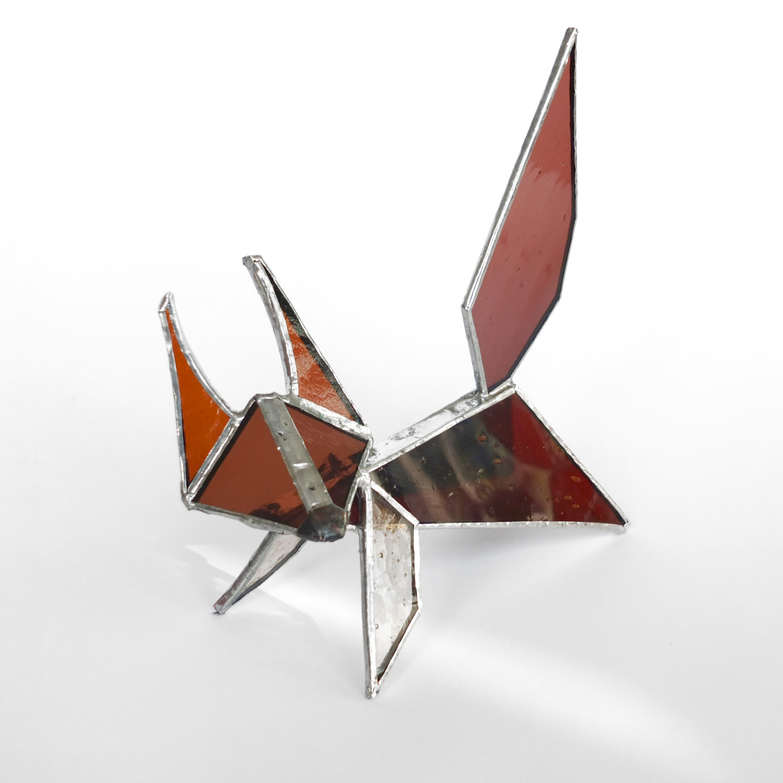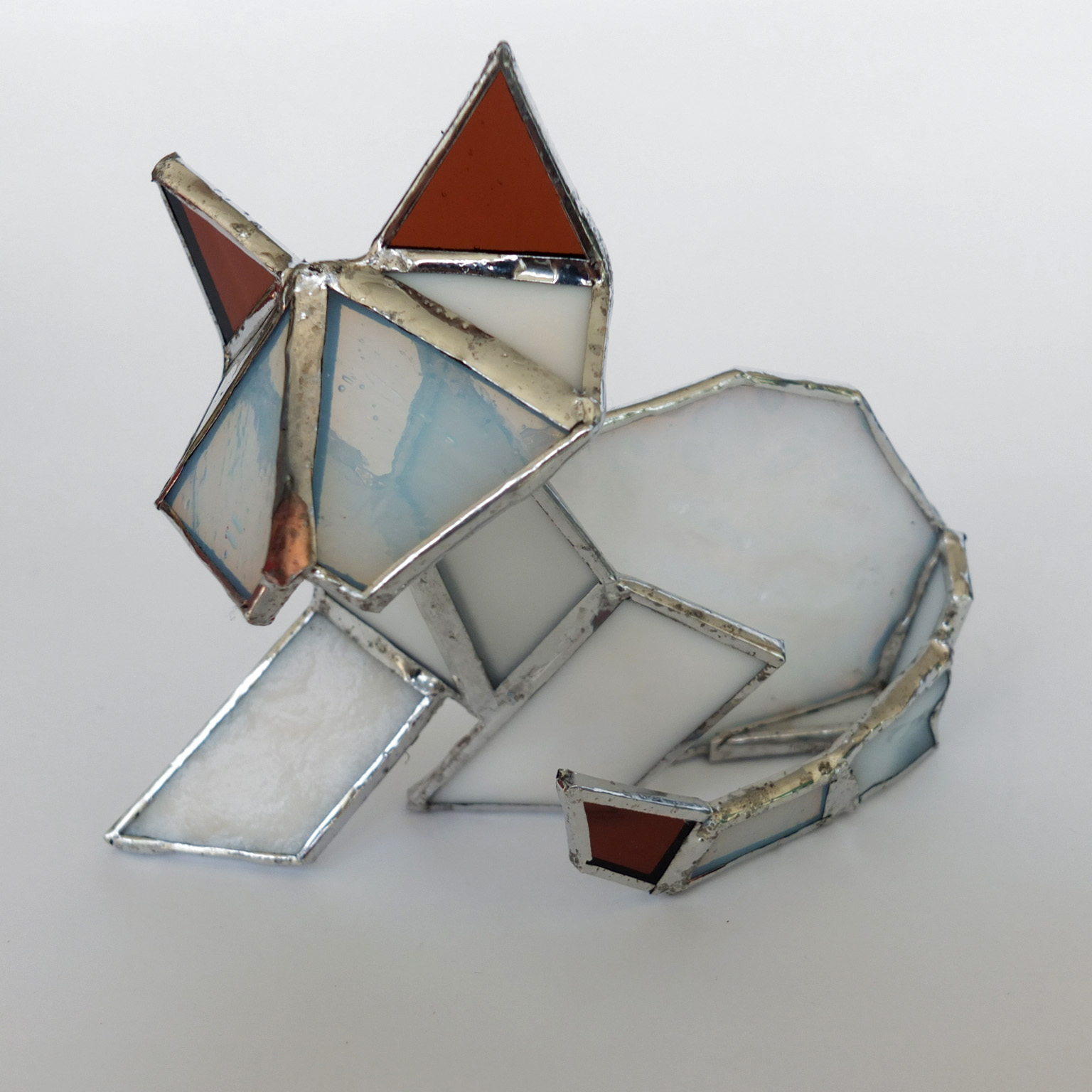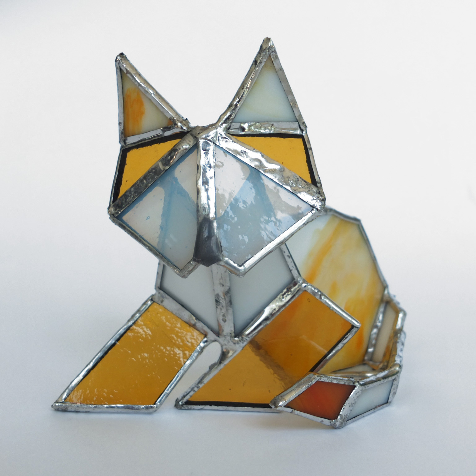 Renard de verre dans des tons oranges, aux oreilles rousses.