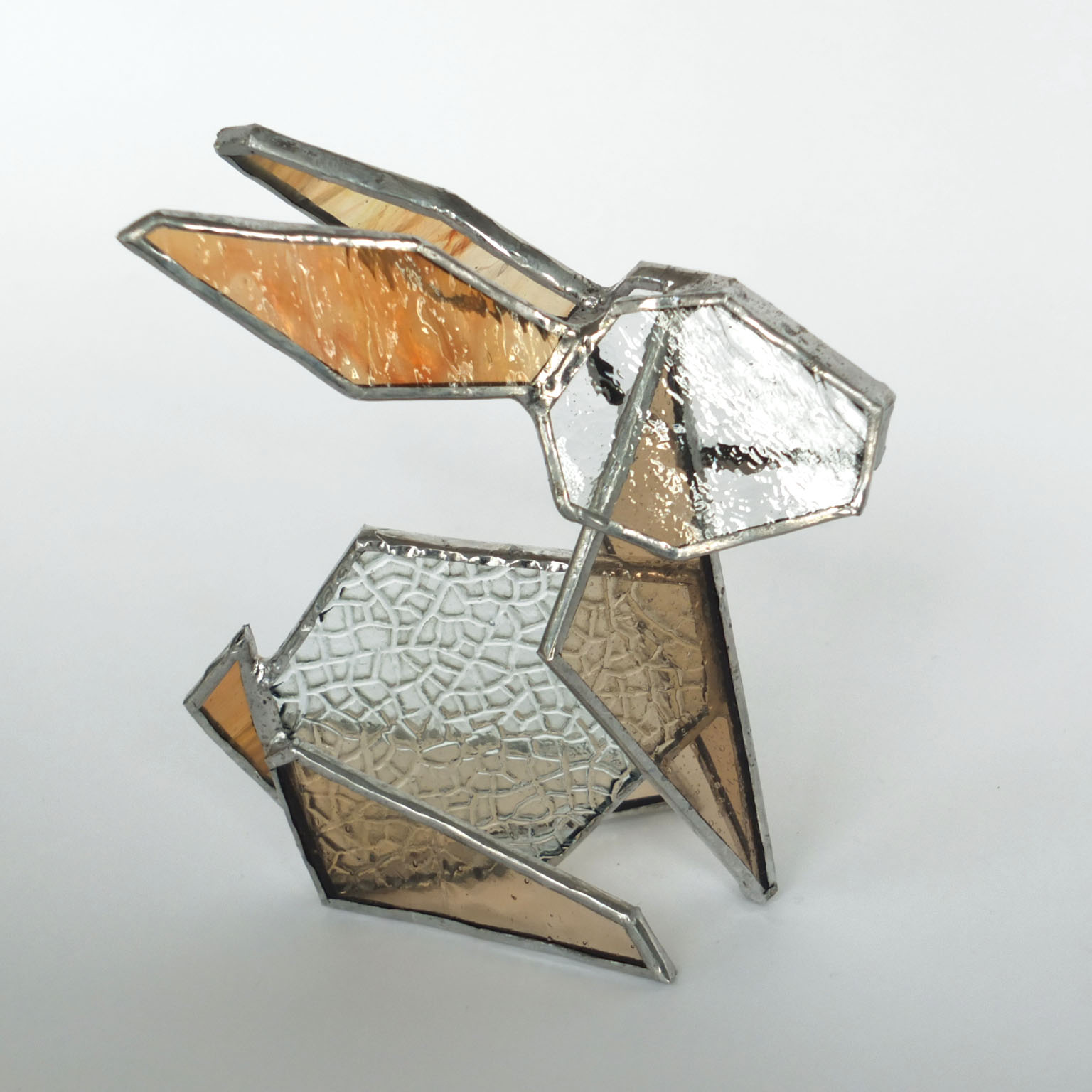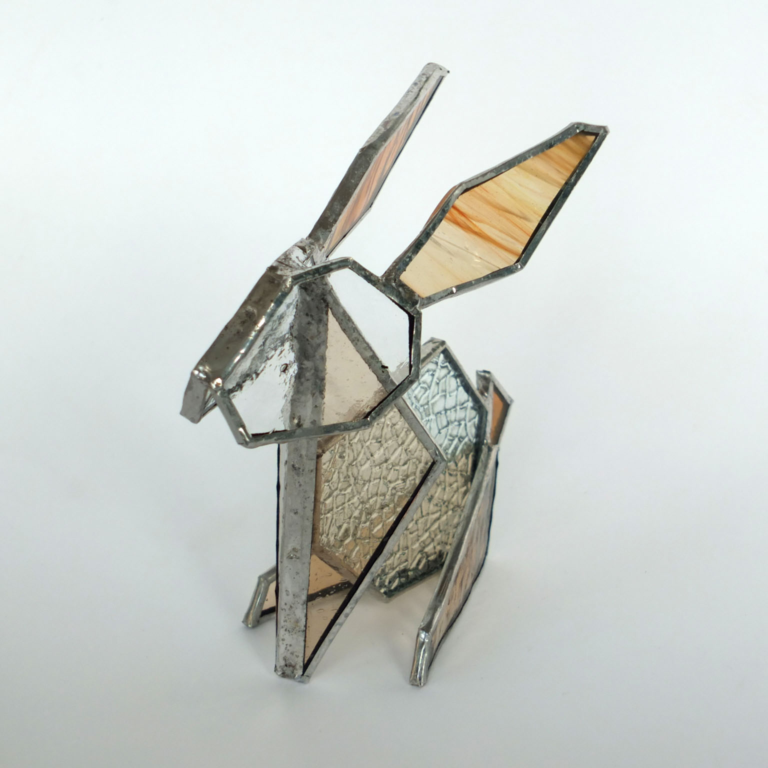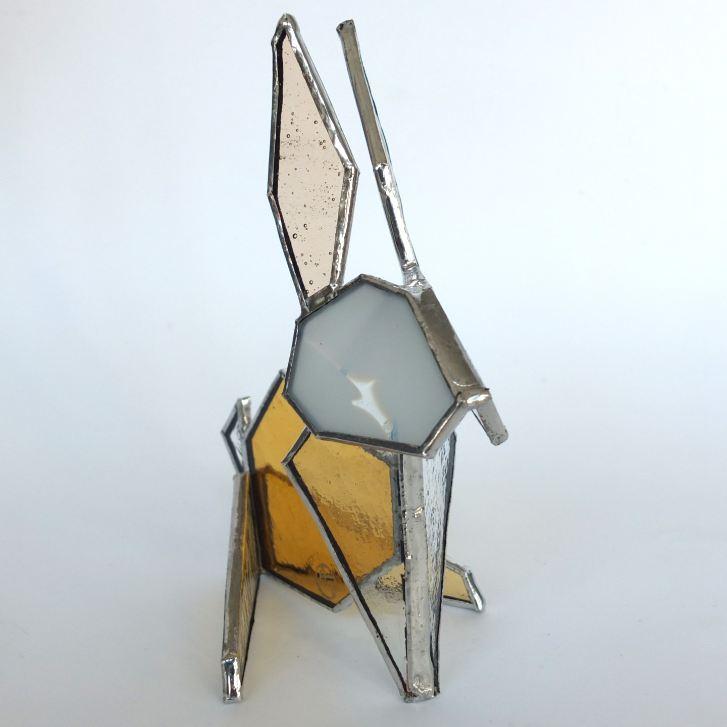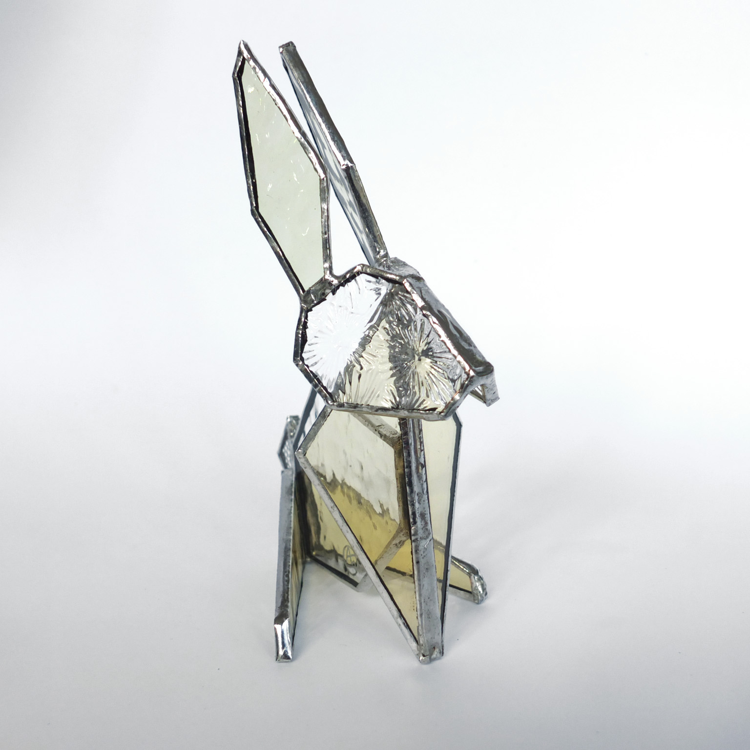 Lapin de verre aux oreilles dressées, tête fleurie et ton paille assez subtile. Hauteur env.12cm.