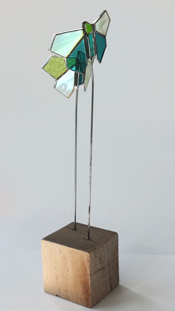 Petit papillon colibri en verre aux ailes roses et oranges. A piquer dans une plante Taille du papillon +/-6cm, tige en acier 33cm.
