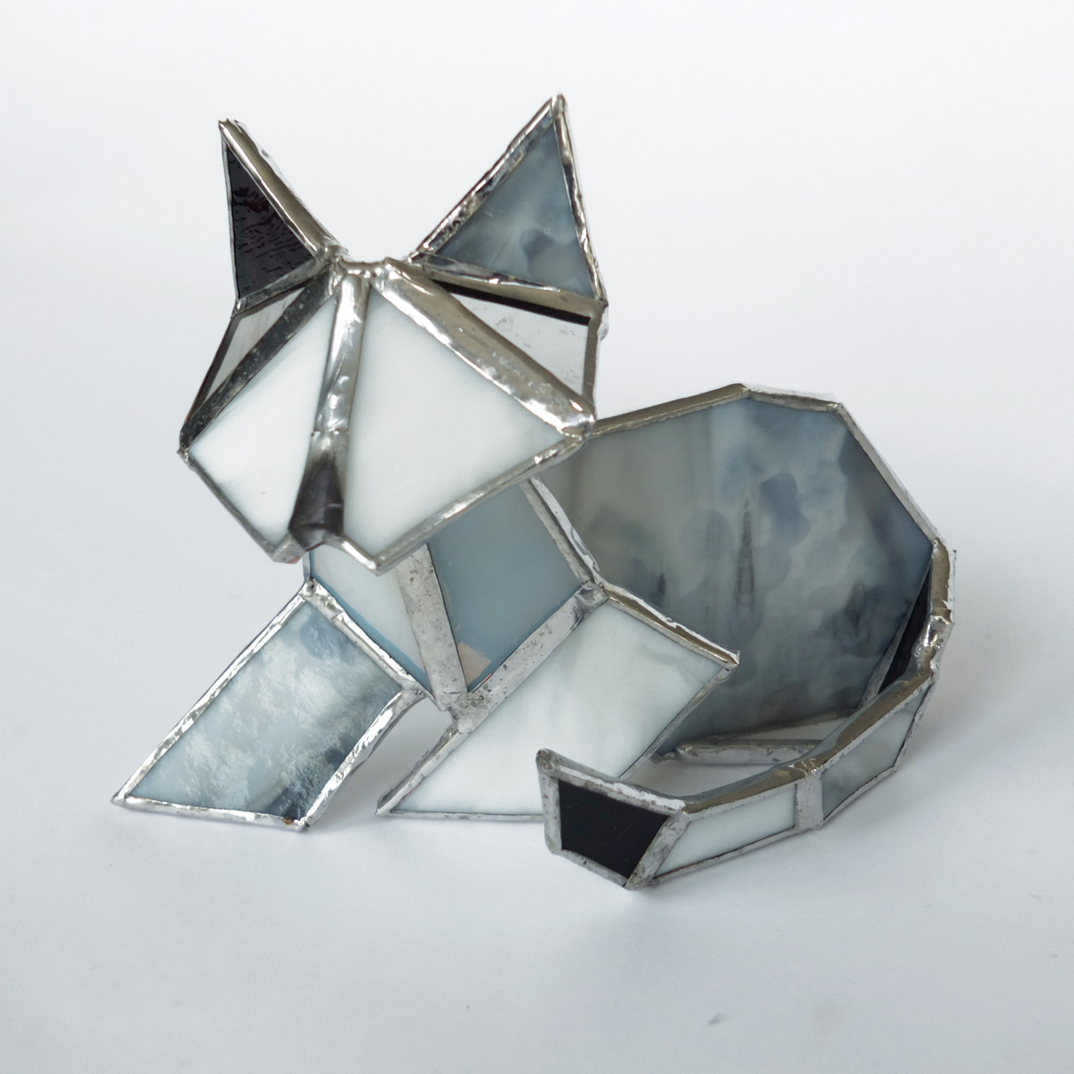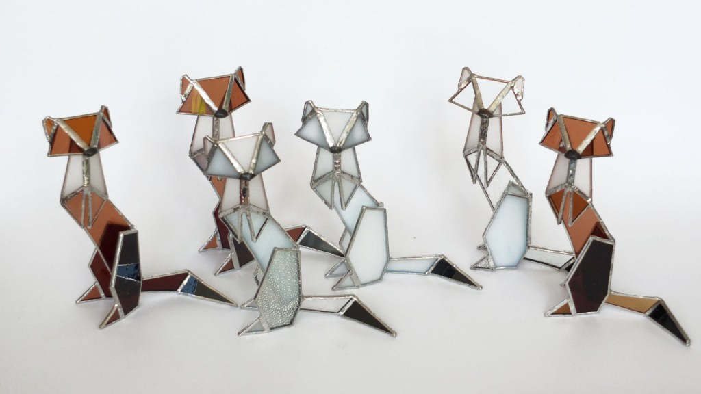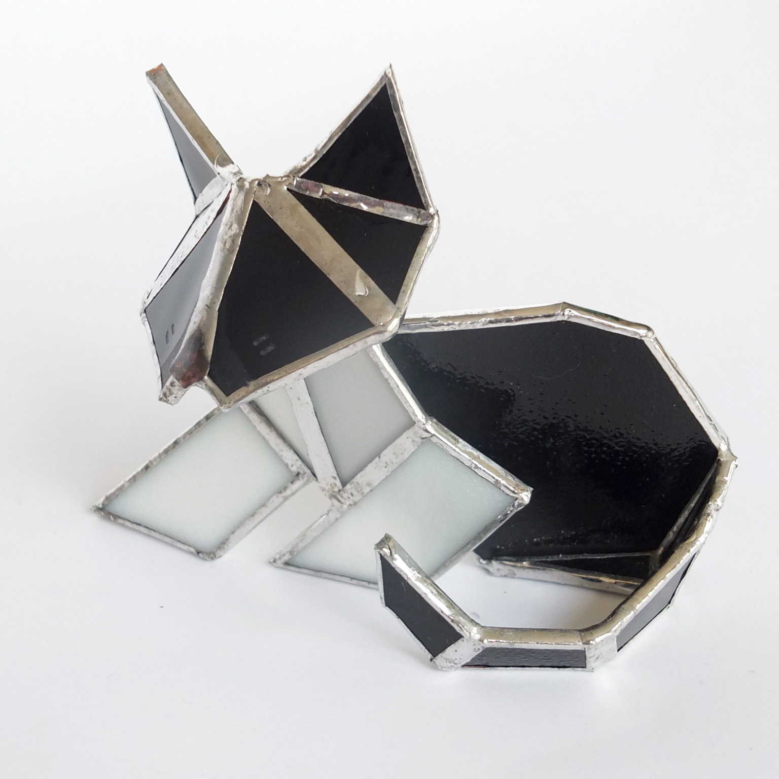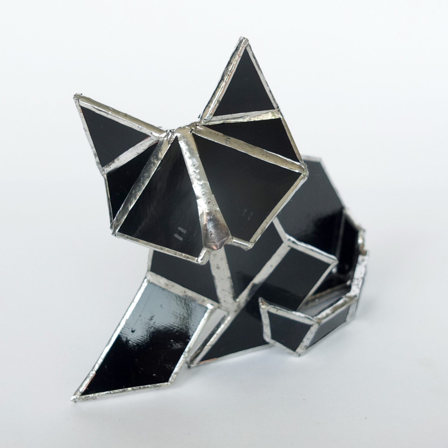 Renard de verre dans des tons roux et oranges, aux oreilles foncées.