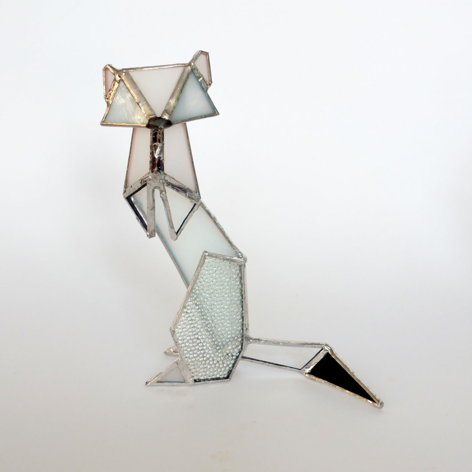 Hermine au pelage d’hiver, en verre blanc, tête opaque et cuisses en verre pointillé. Hauteur +/-14cm.