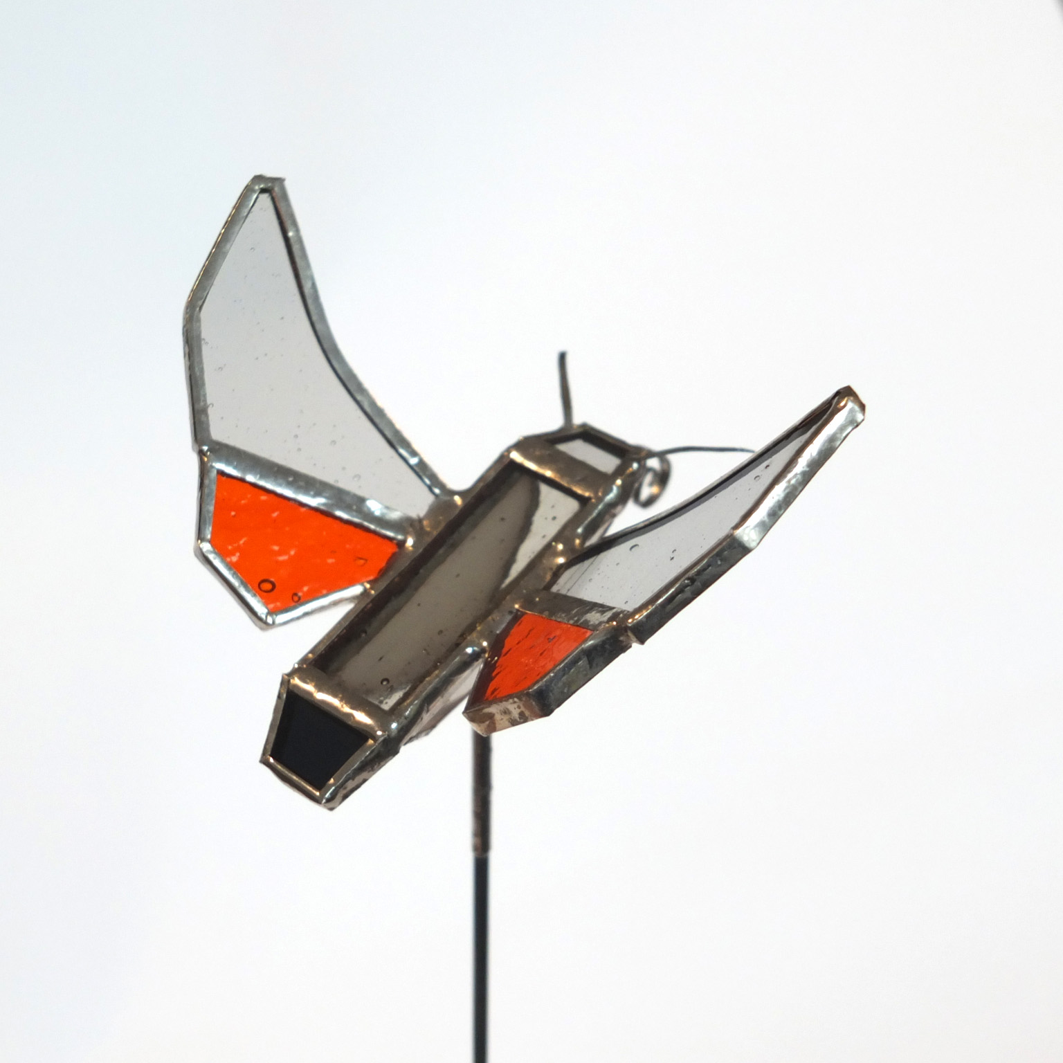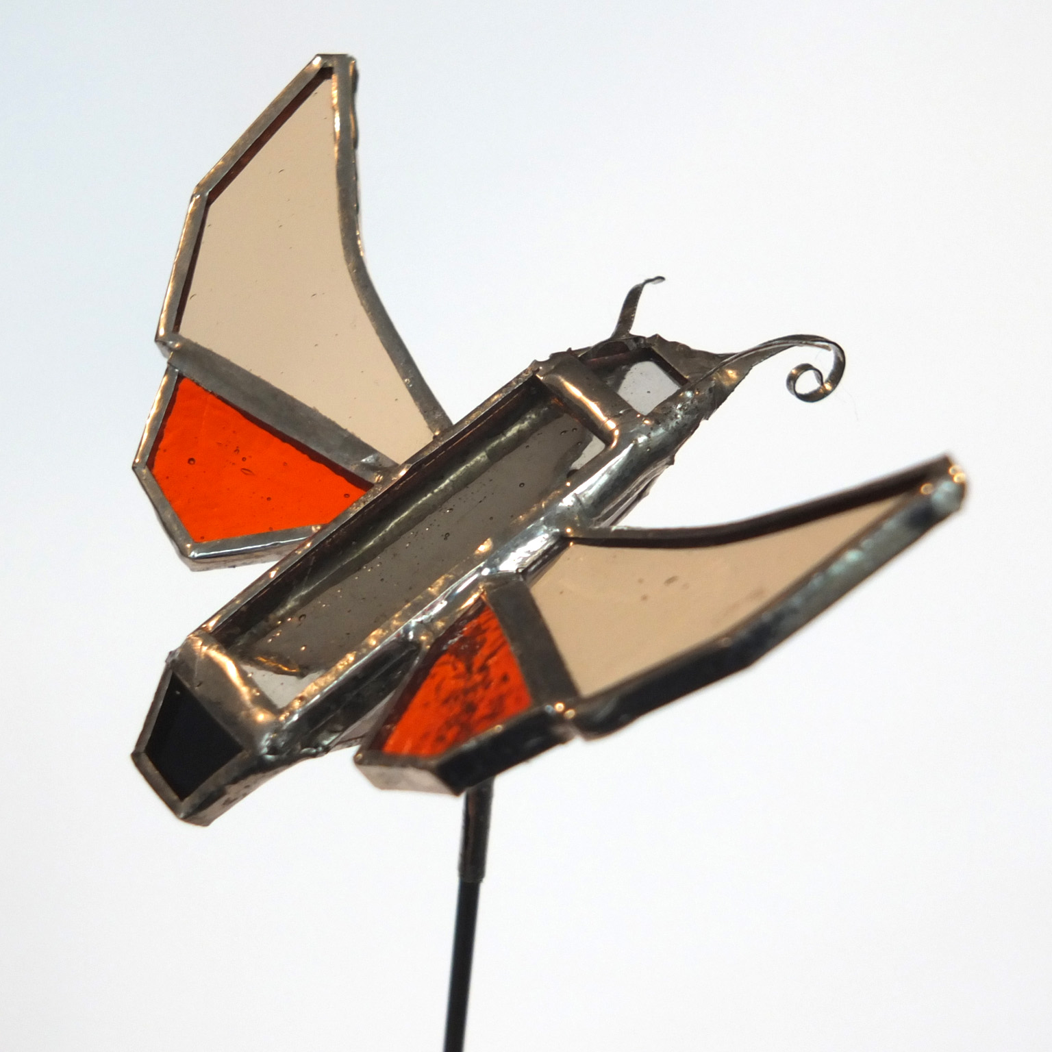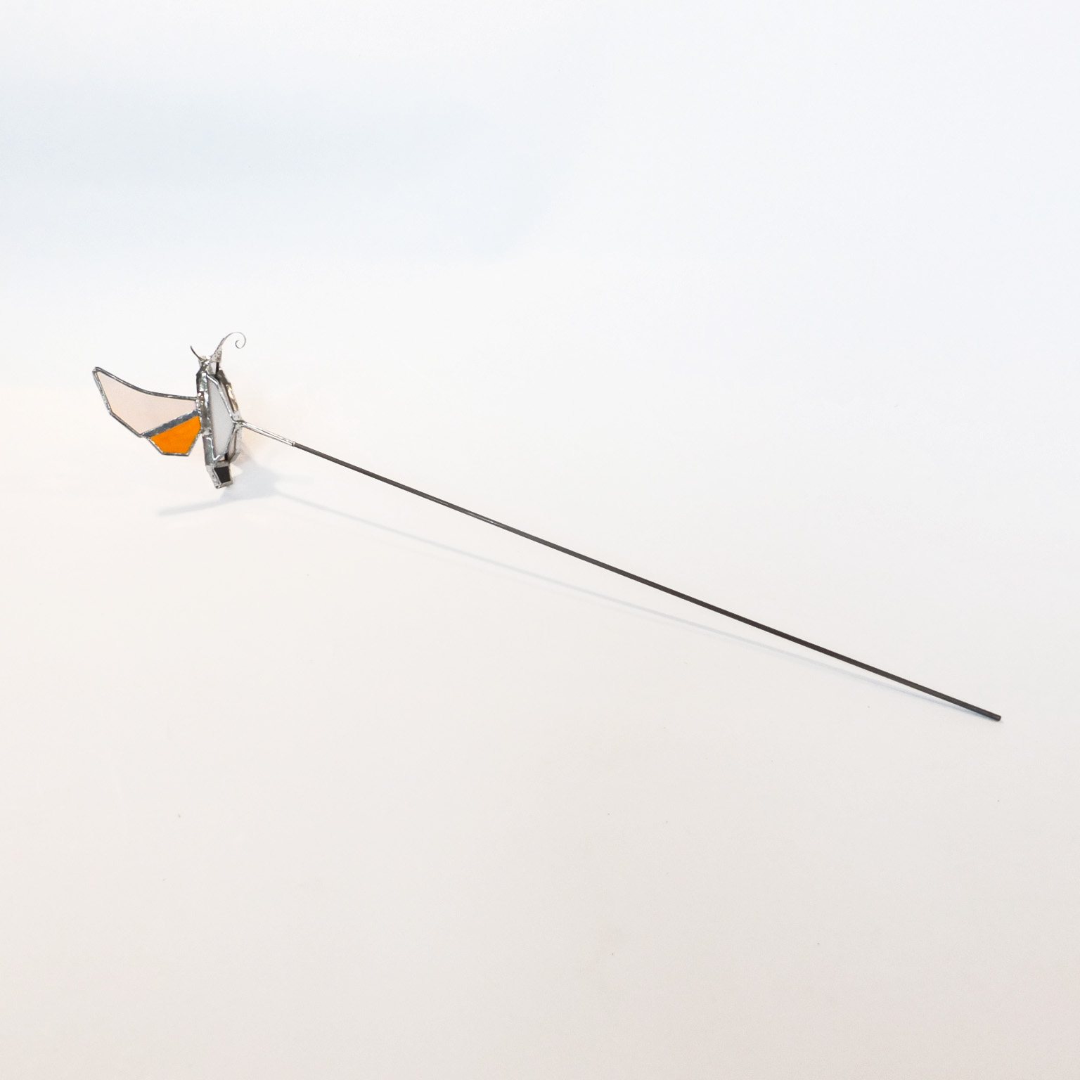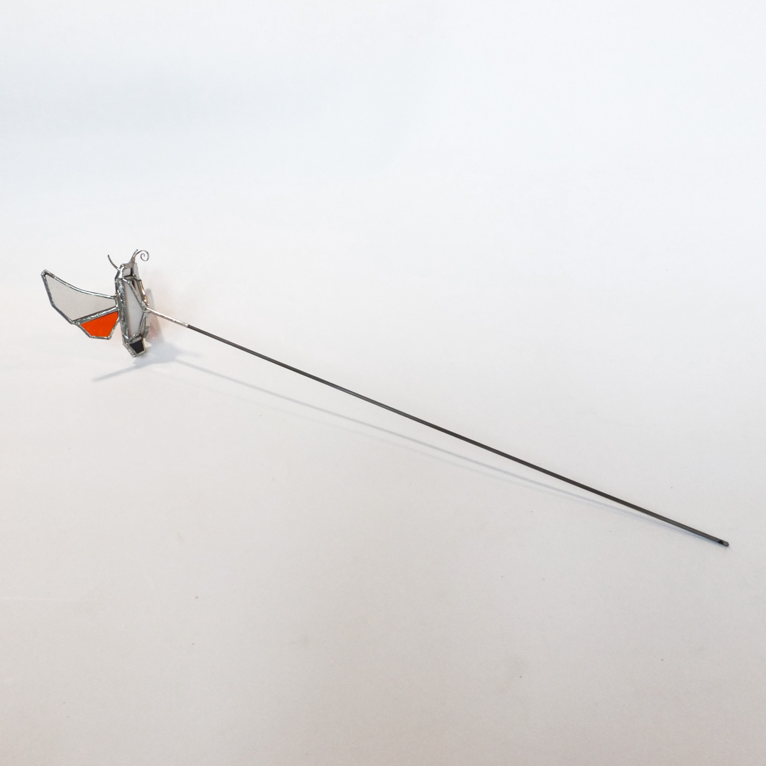 Petit papillon colibri en verre aux ailes grises et orange vif. A piquer dans une plante Taille du papillon +/-6cm, tige en acier 33cm.