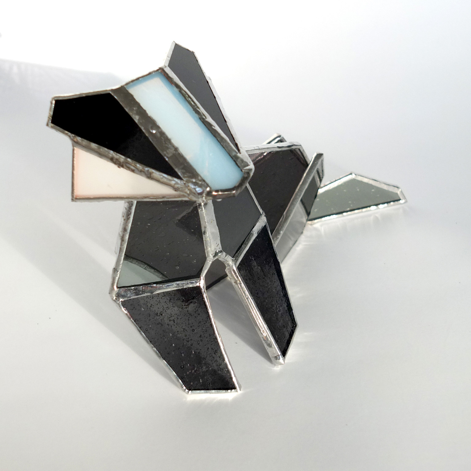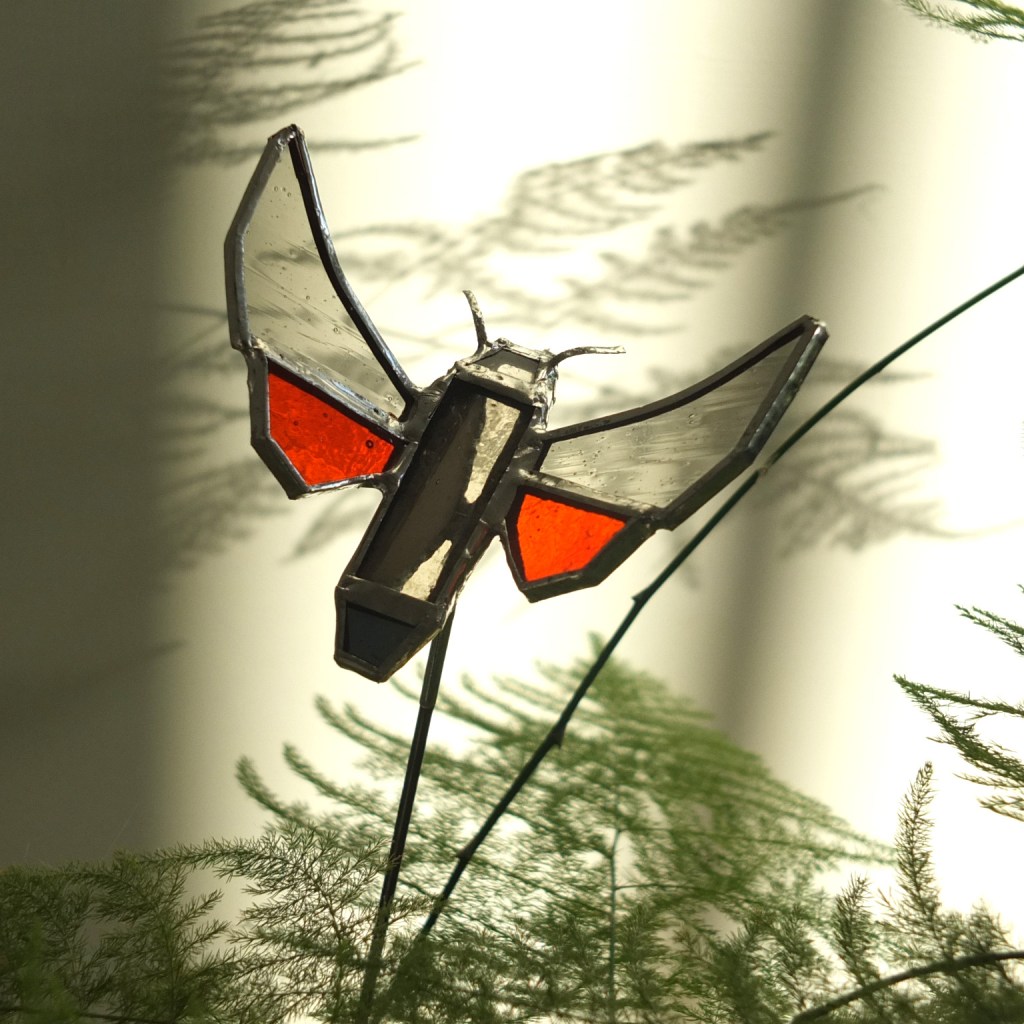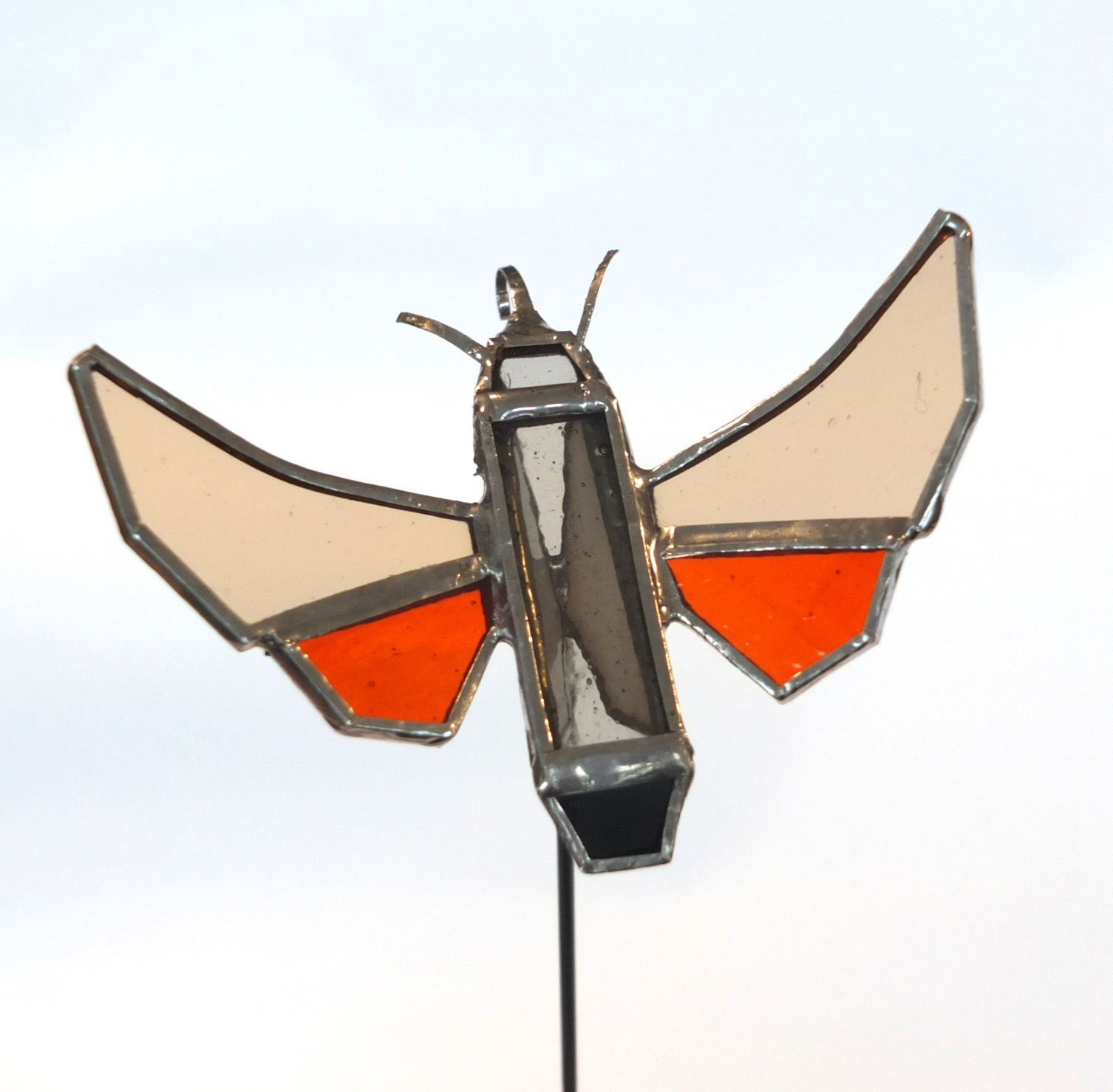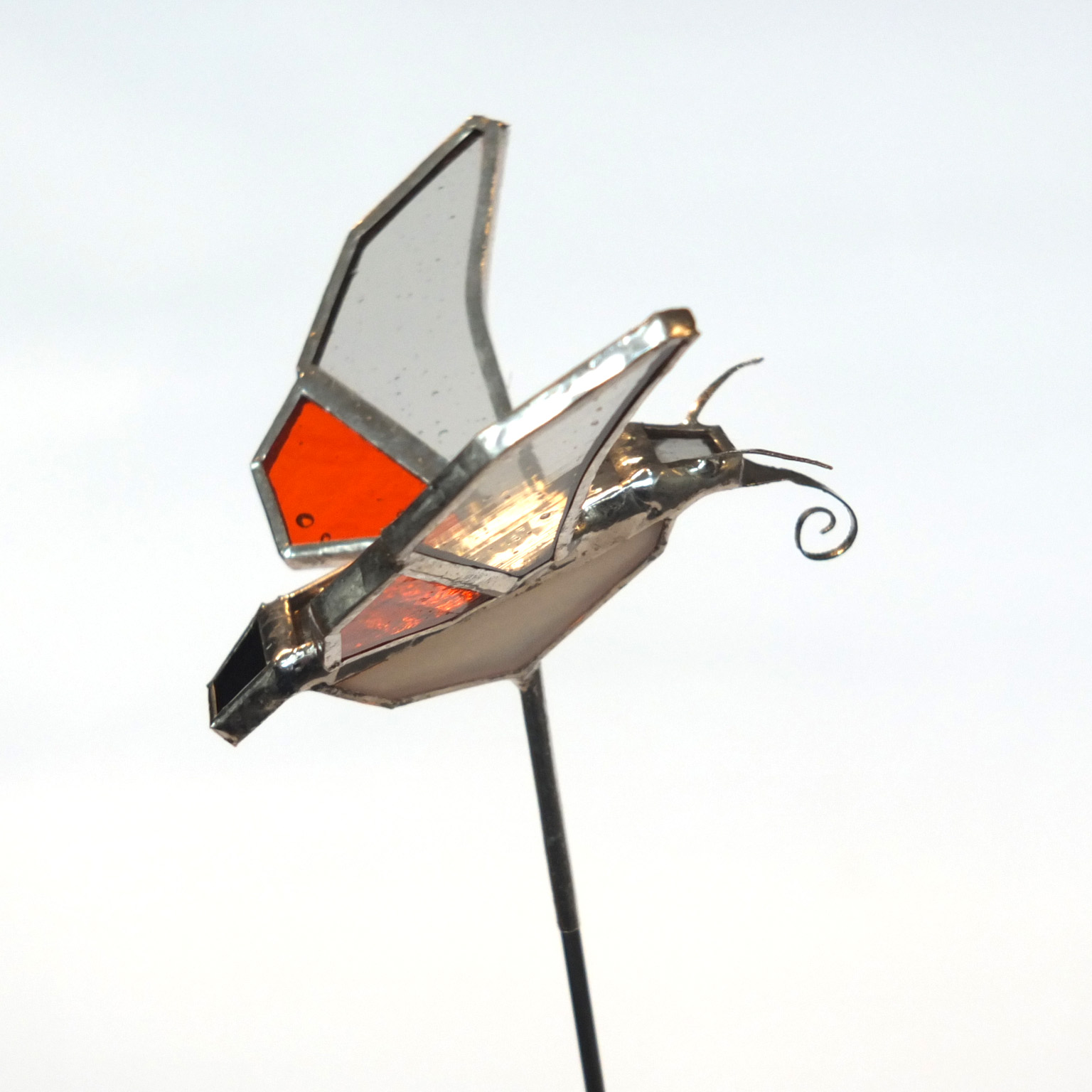 Petit papillon colibri en verre aux ailes grises et orange vif. A piquer dans une plante Taille du papillon +/-6cm, tige en acier 33cm.