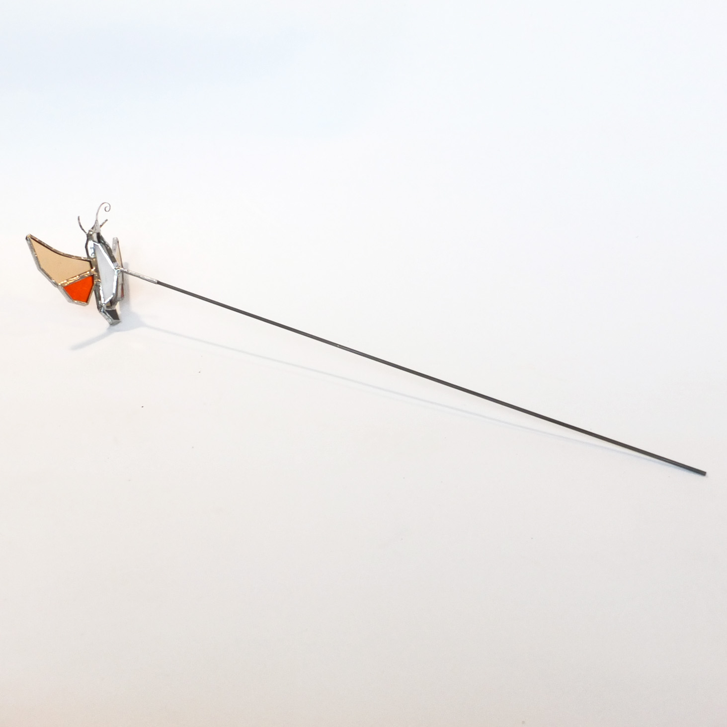 Petit papillon colibri en verre aux ailes pêche et orange vif. A piquer dans une plante Taille du papillon +/-6cm, tige en acier 33cm.