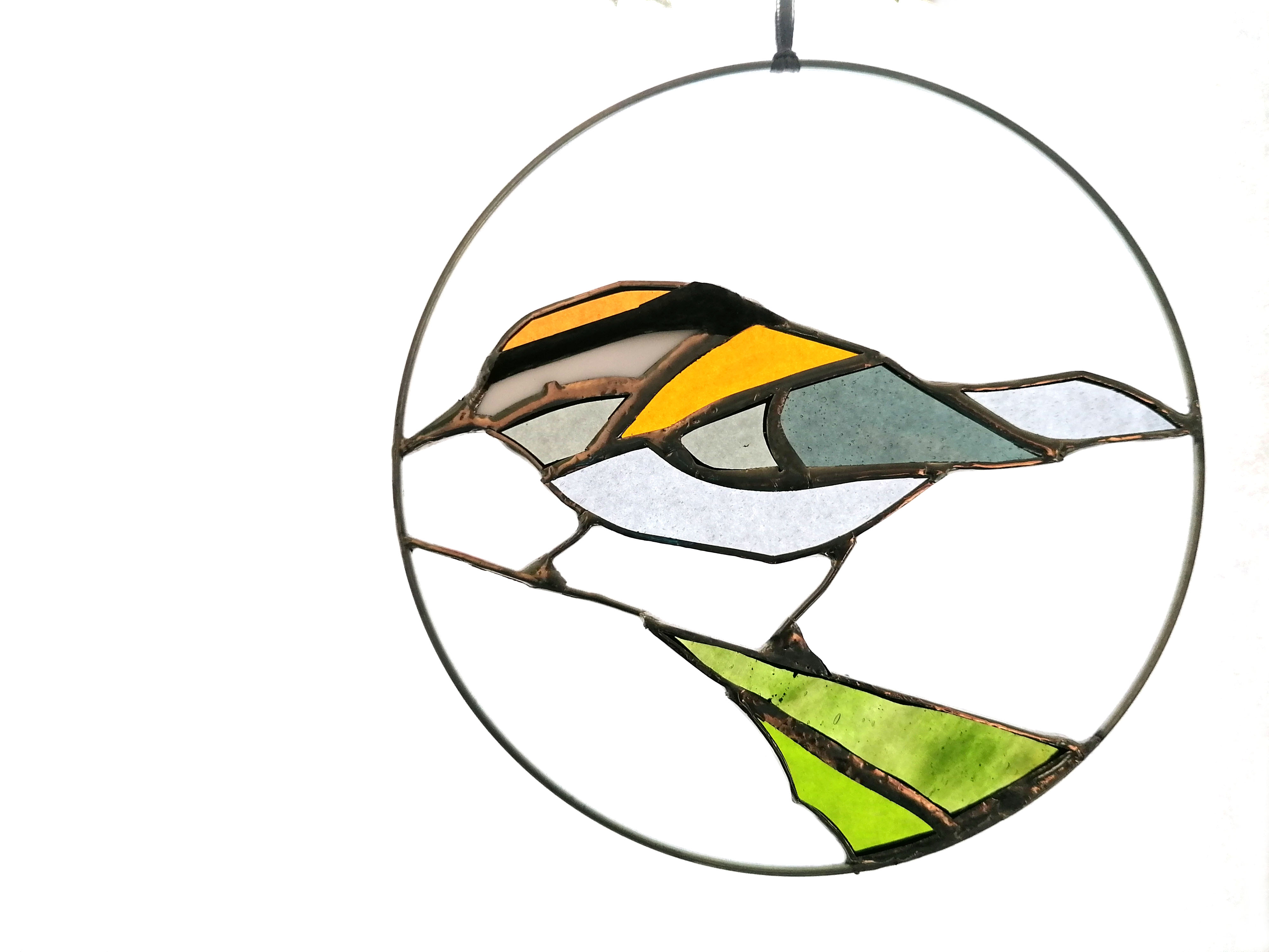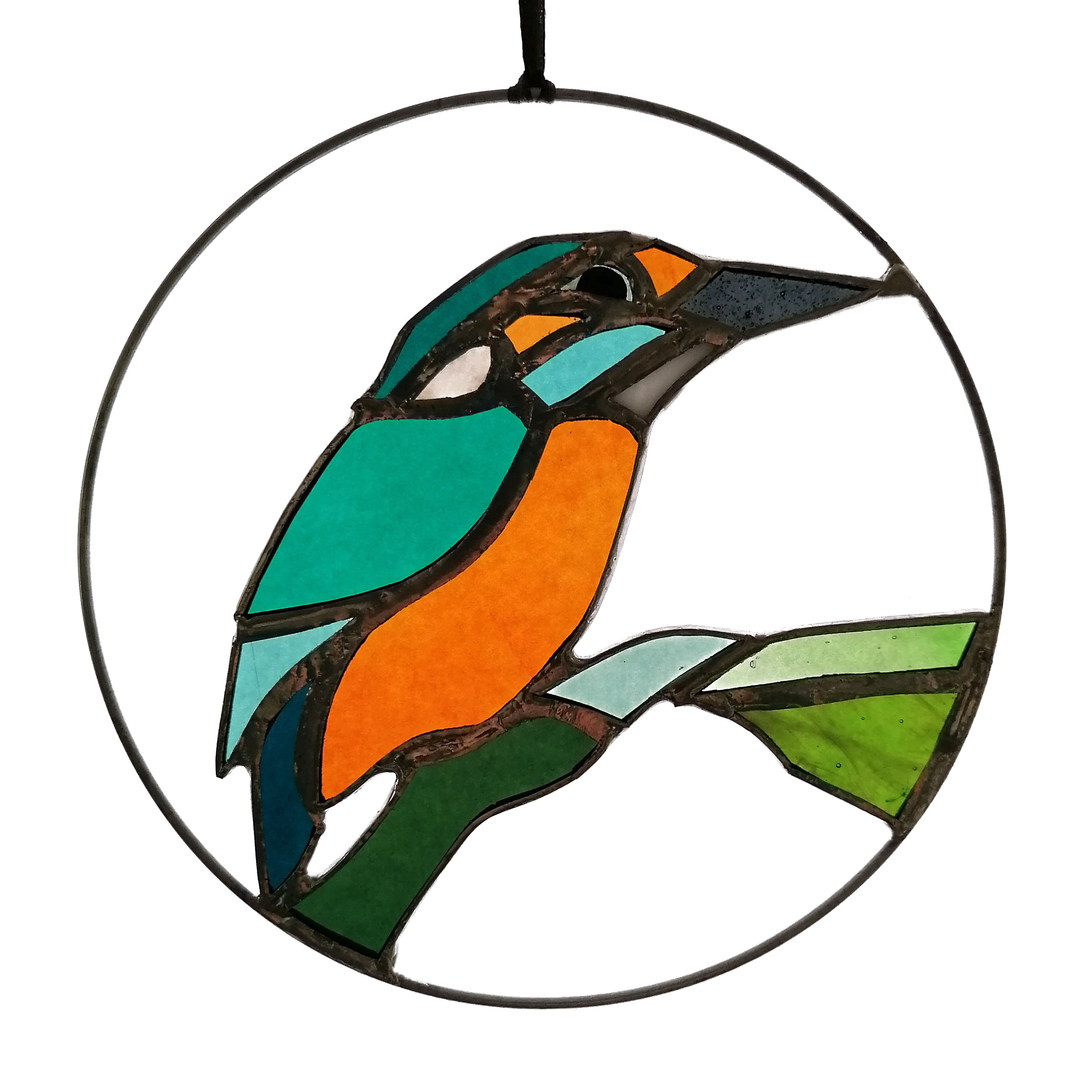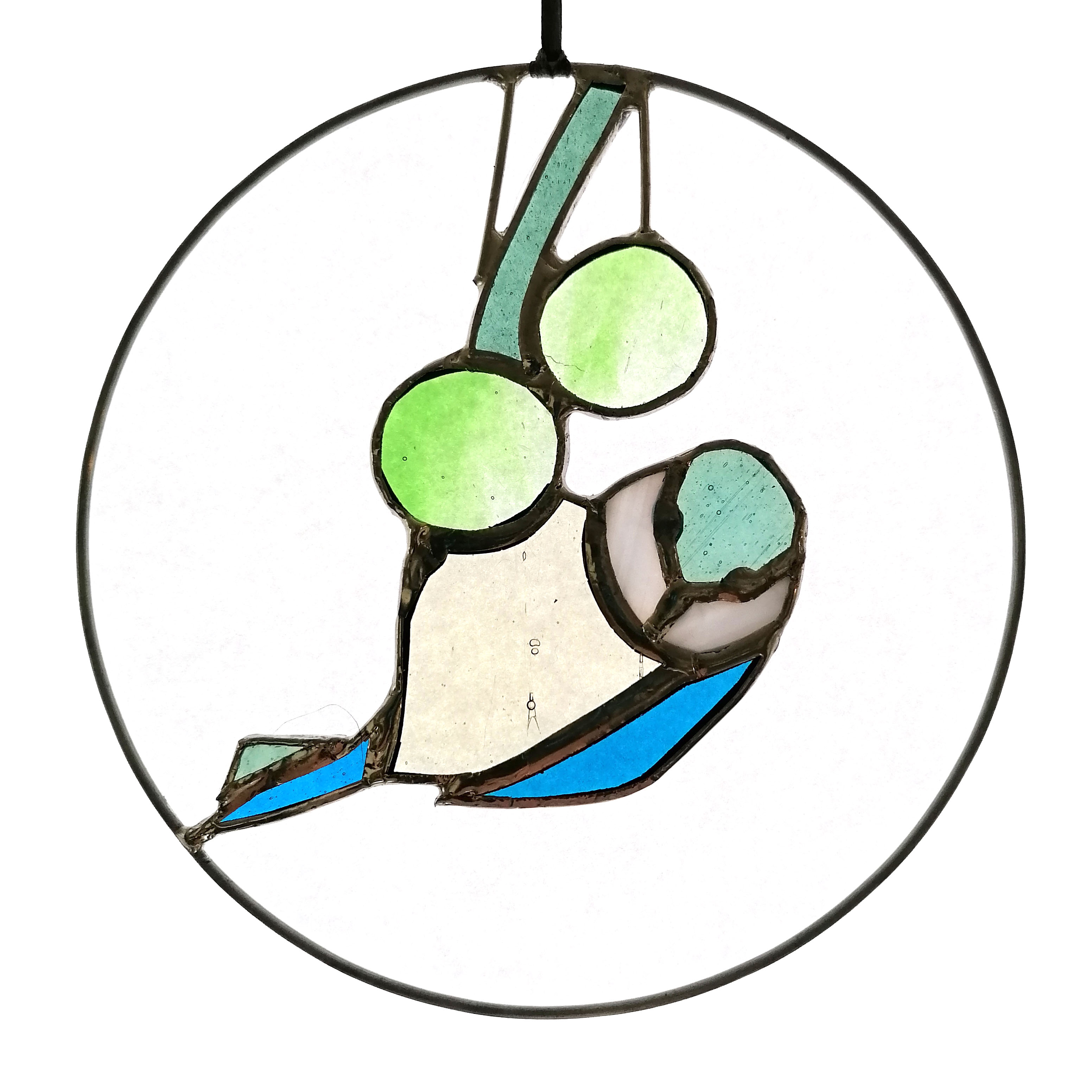 Médaillon à suspendre en verre ajouré de 15cm de diamètre, représentant un martin-pêcheur dans des variations de tons verts ; émeraude, vert d’eau…