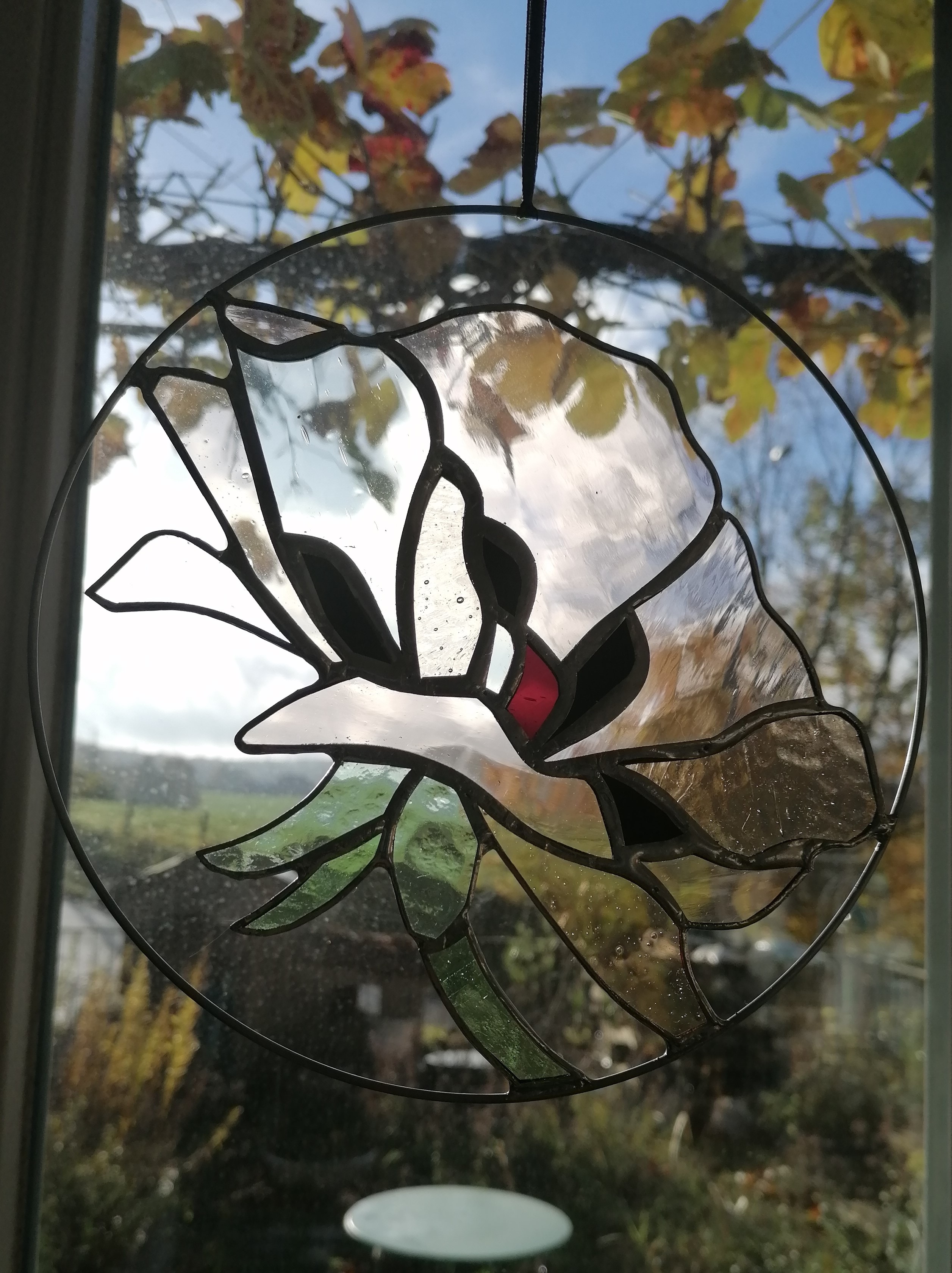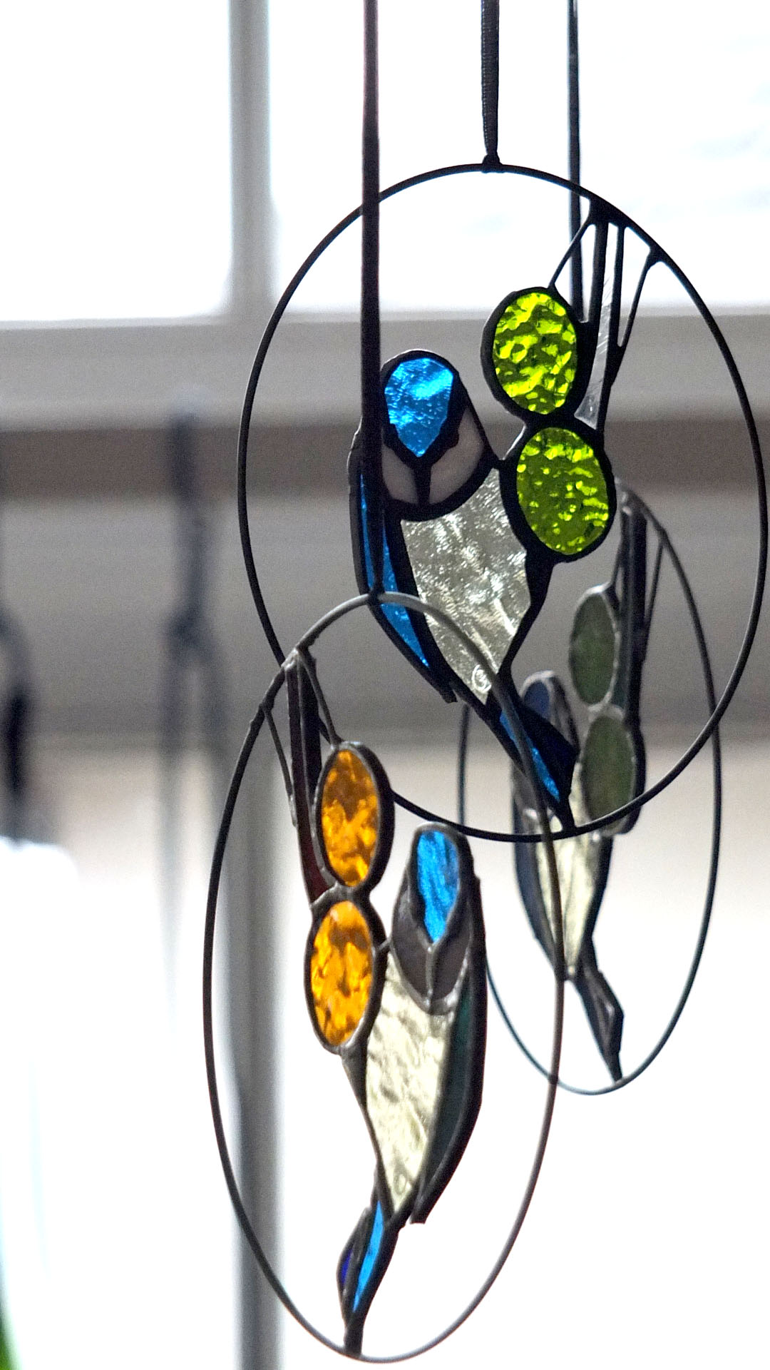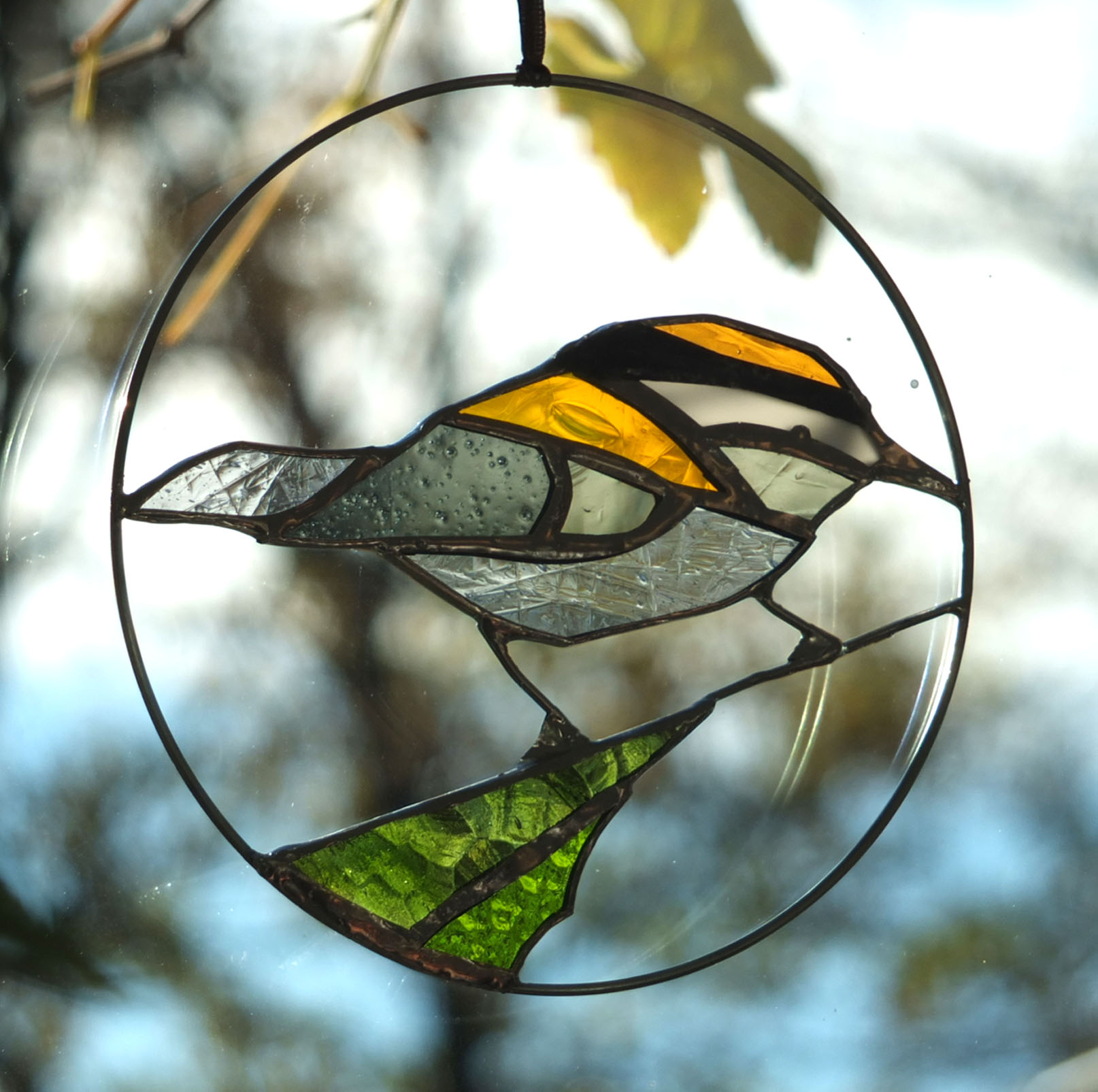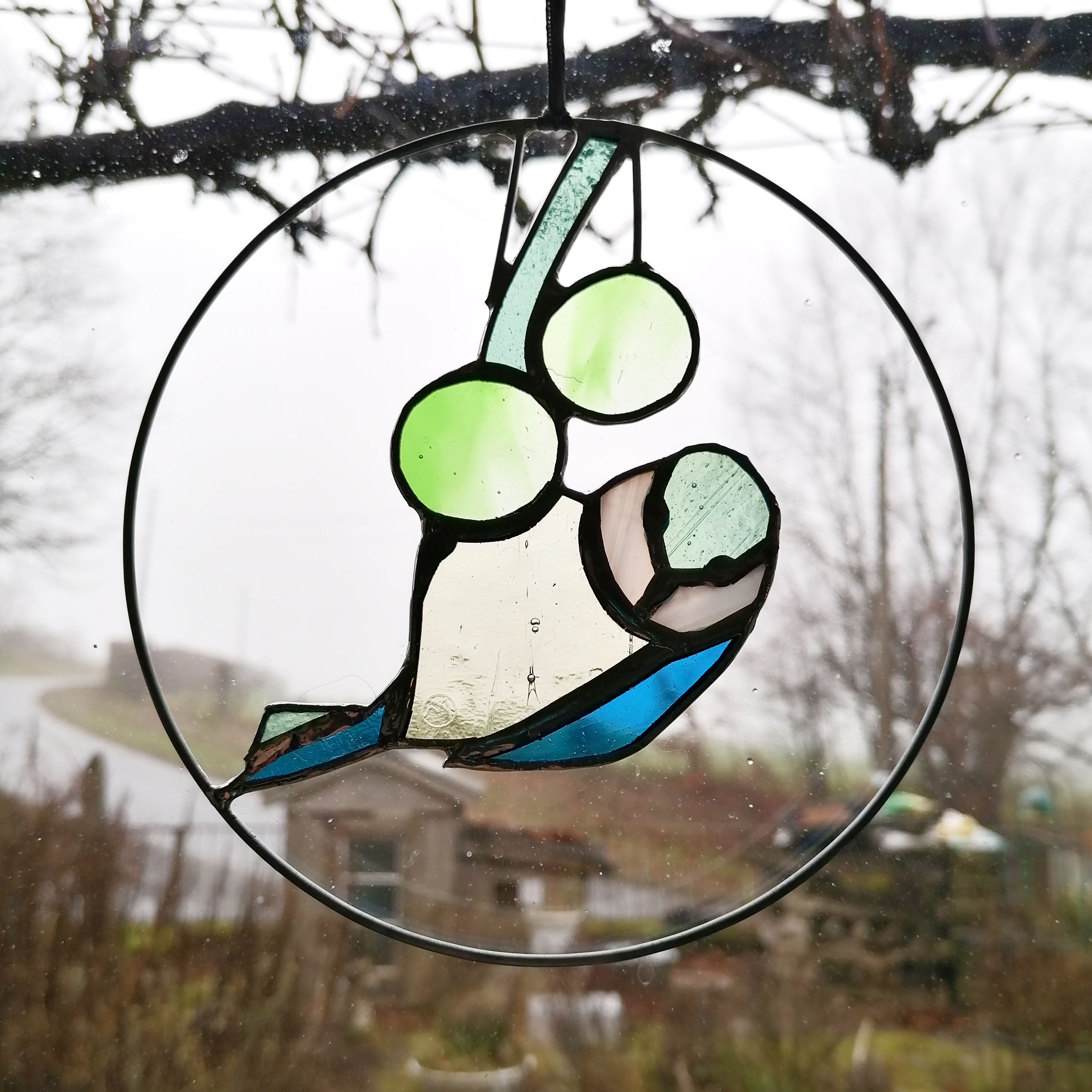 Médaillon à suspendre en verre ajouré de 15cm de diamètre, représentant un martin-pêcheur dans des variations de tons verts ; émeraude, vert d’eau…