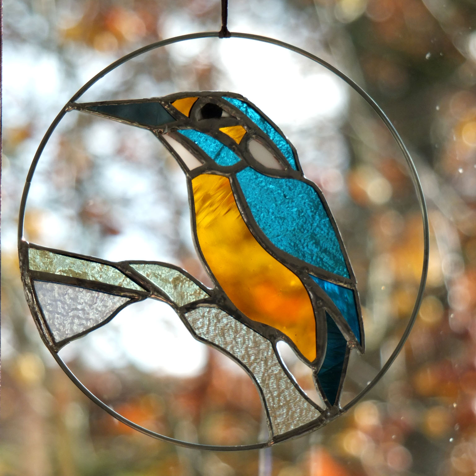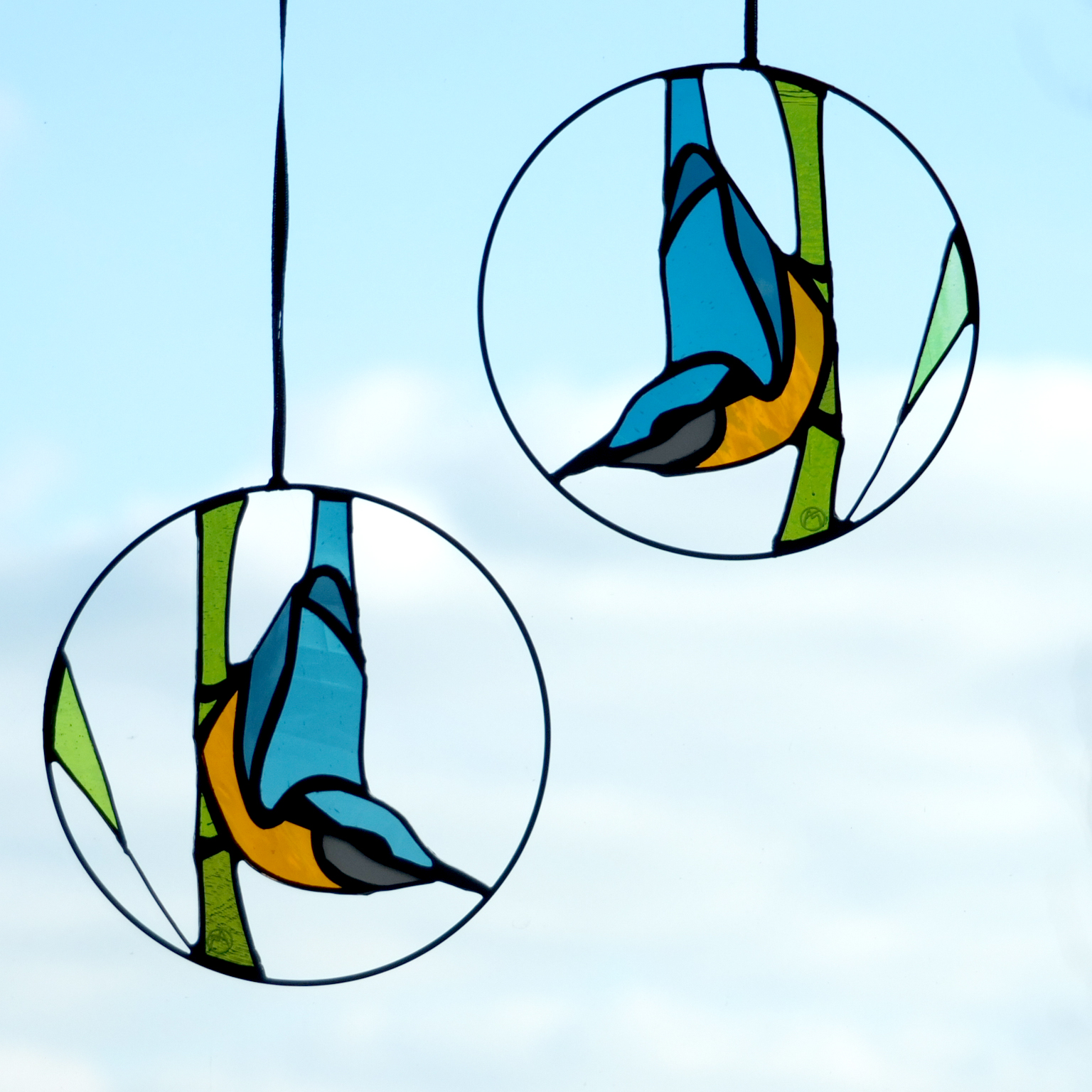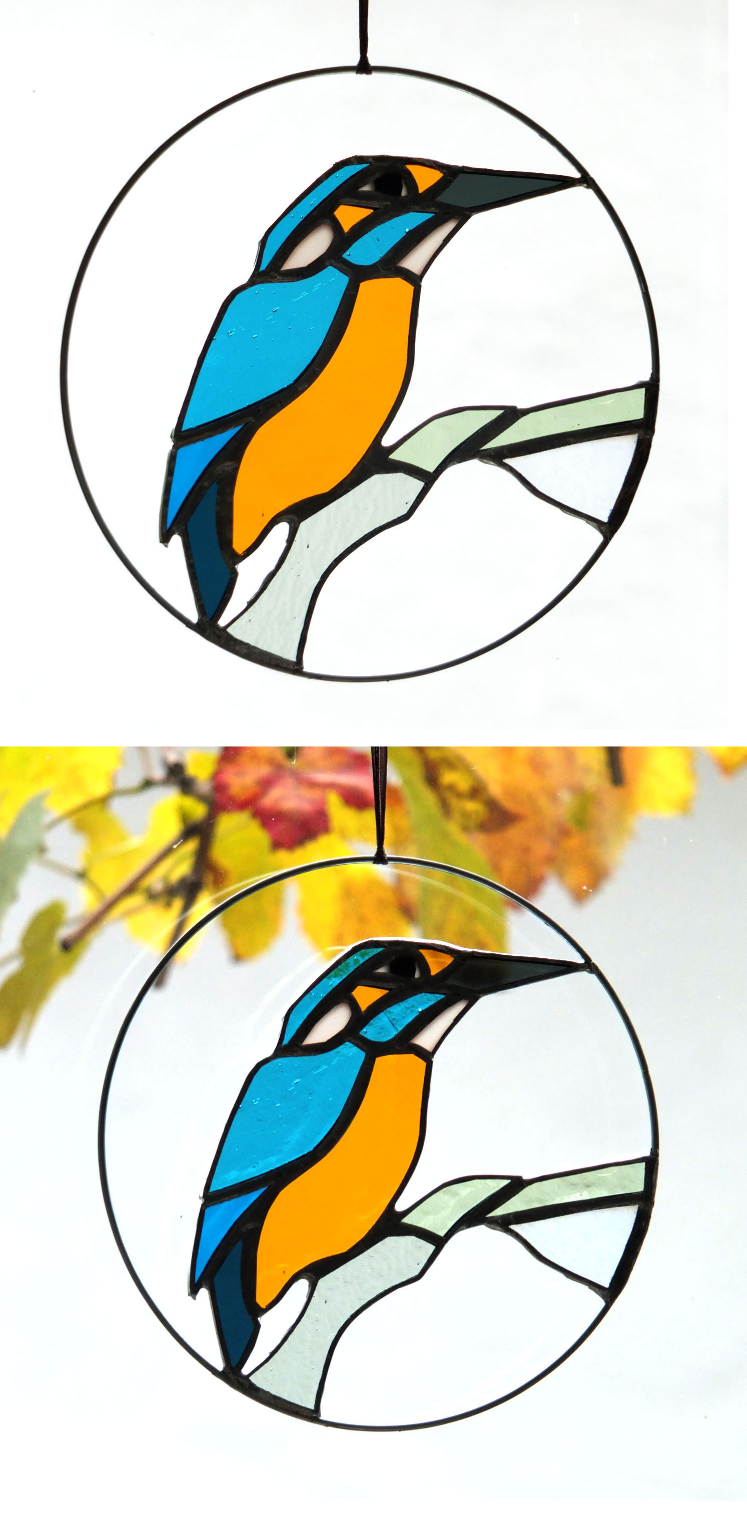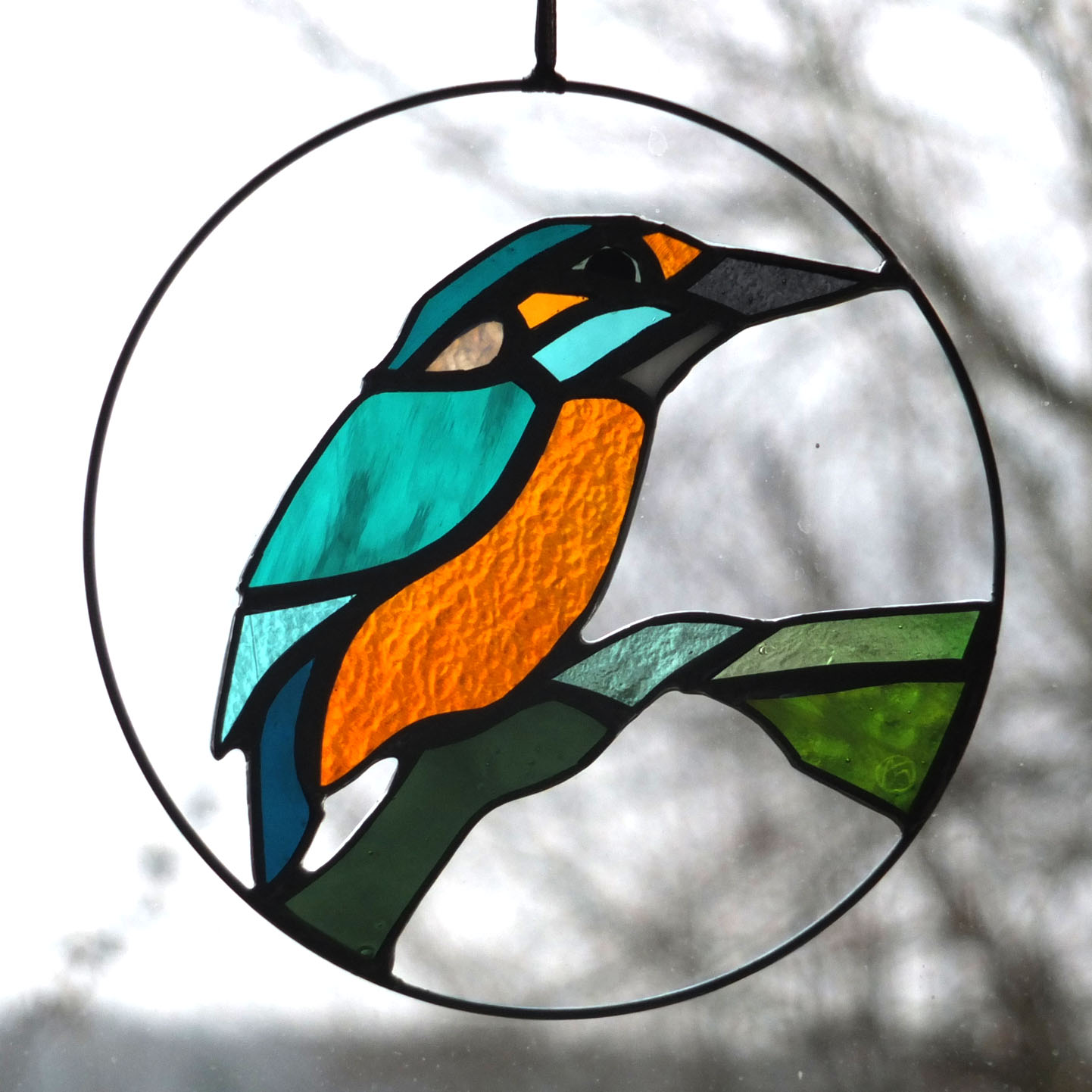 Médaillon à suspendre en verre ajouré de 15cm de diamètre, représentant un martin-pêcheur dans des variations de tons bleus et au ventre orange.
