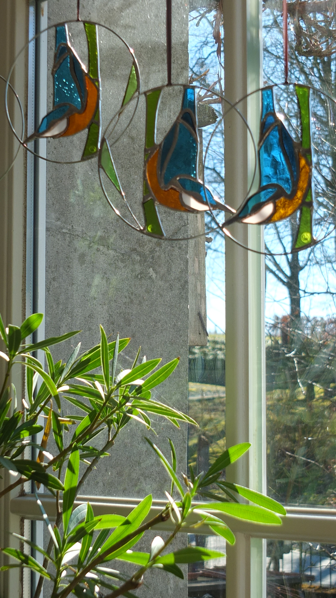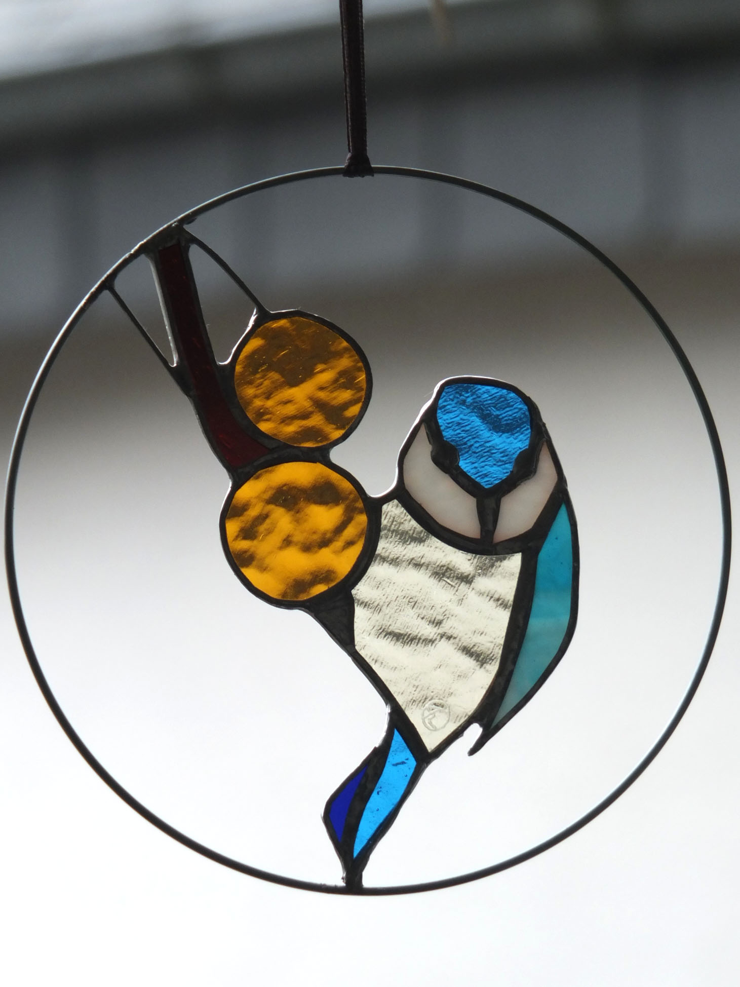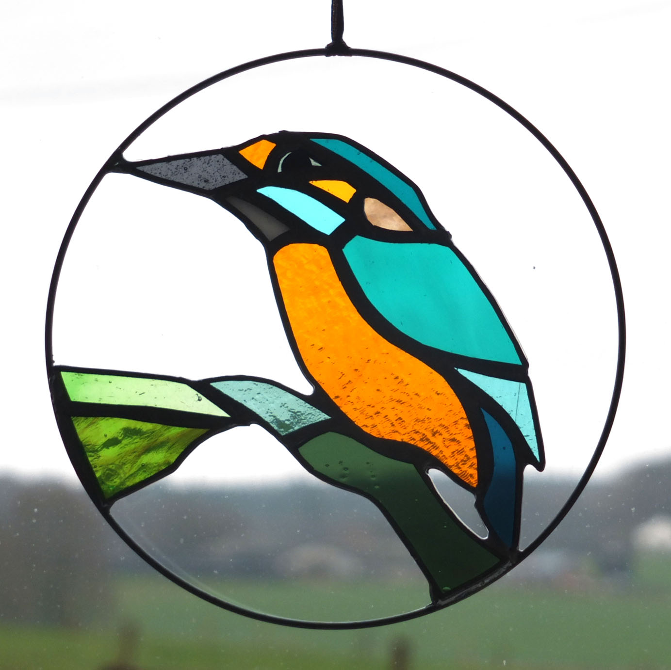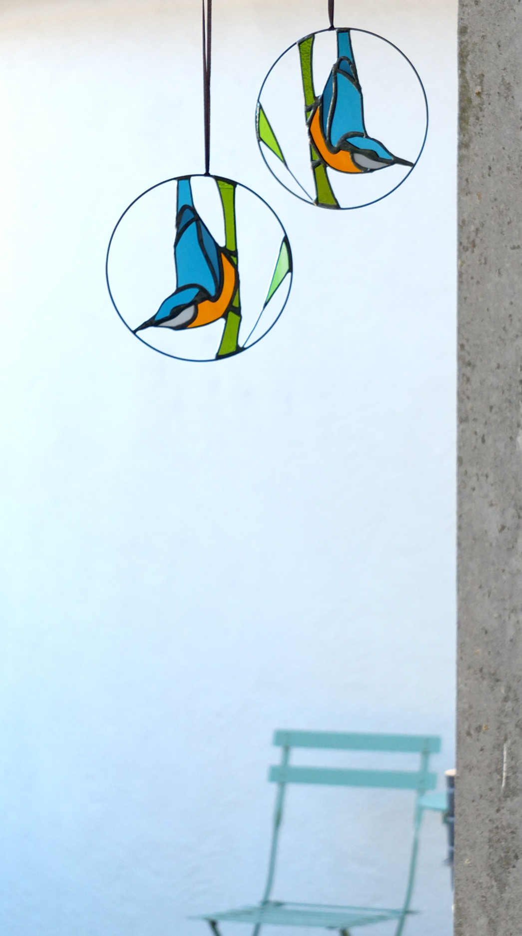 Médaillon à suspendre en verre ajouré de 15cm de diamètre, représentant un martin-pêcheur dans des variations de tons bleus et au ventre orange.