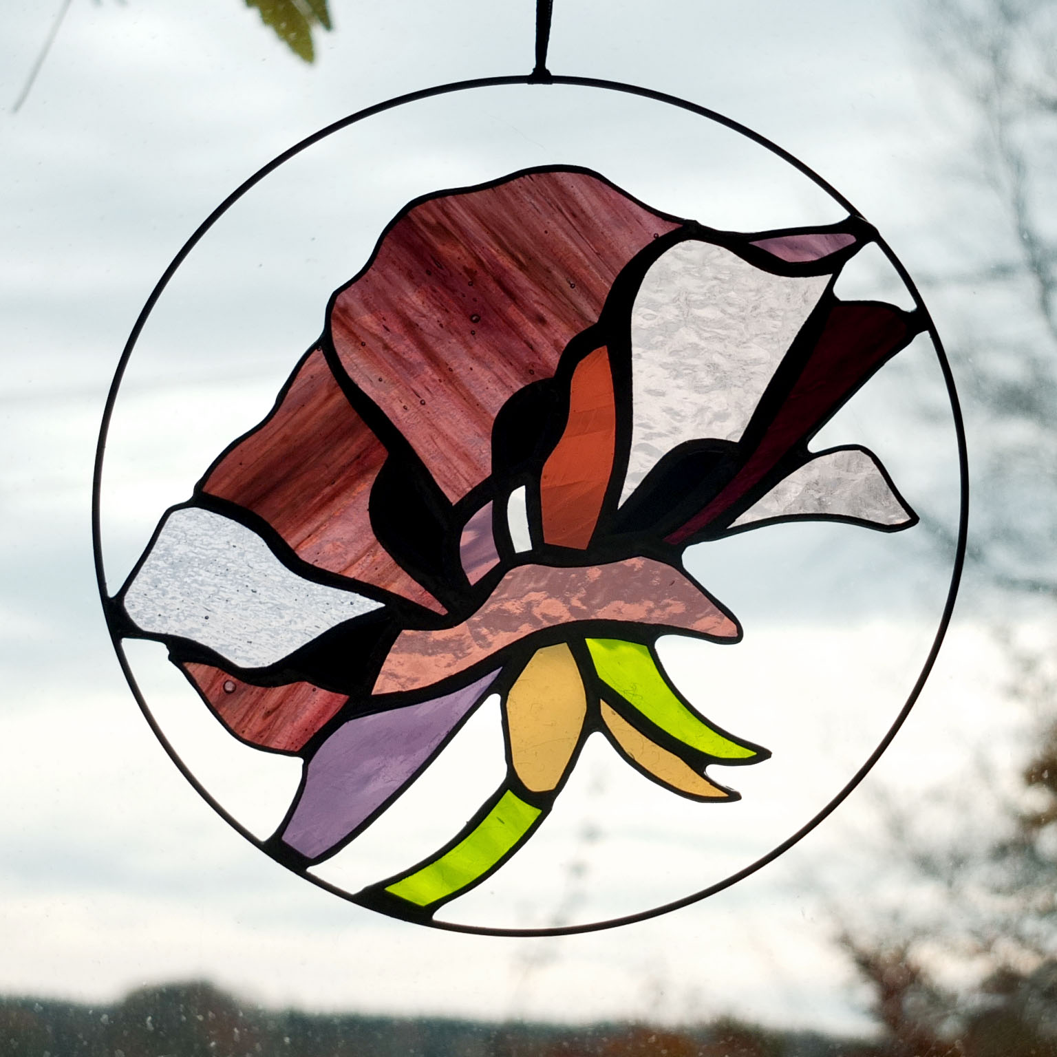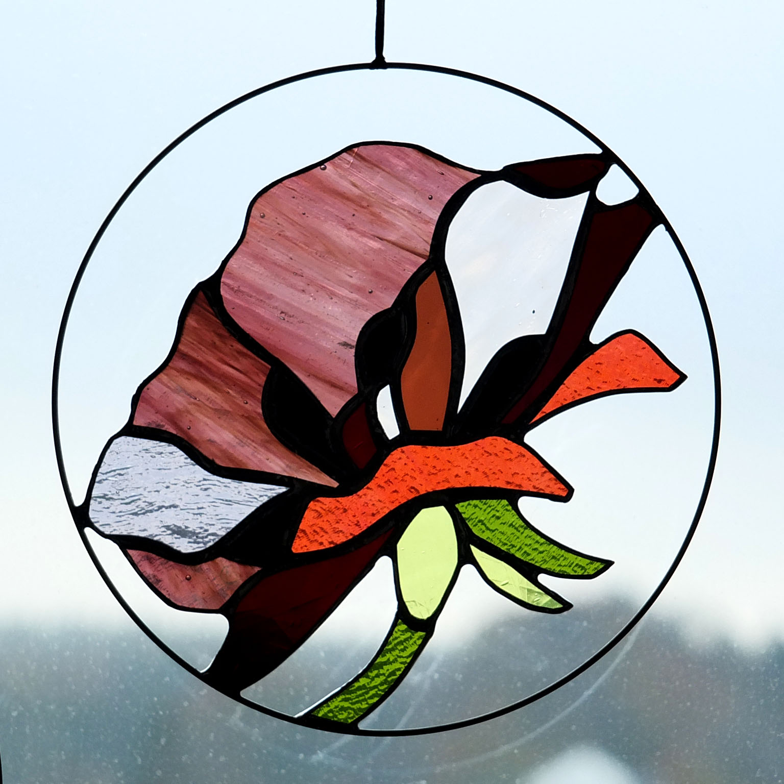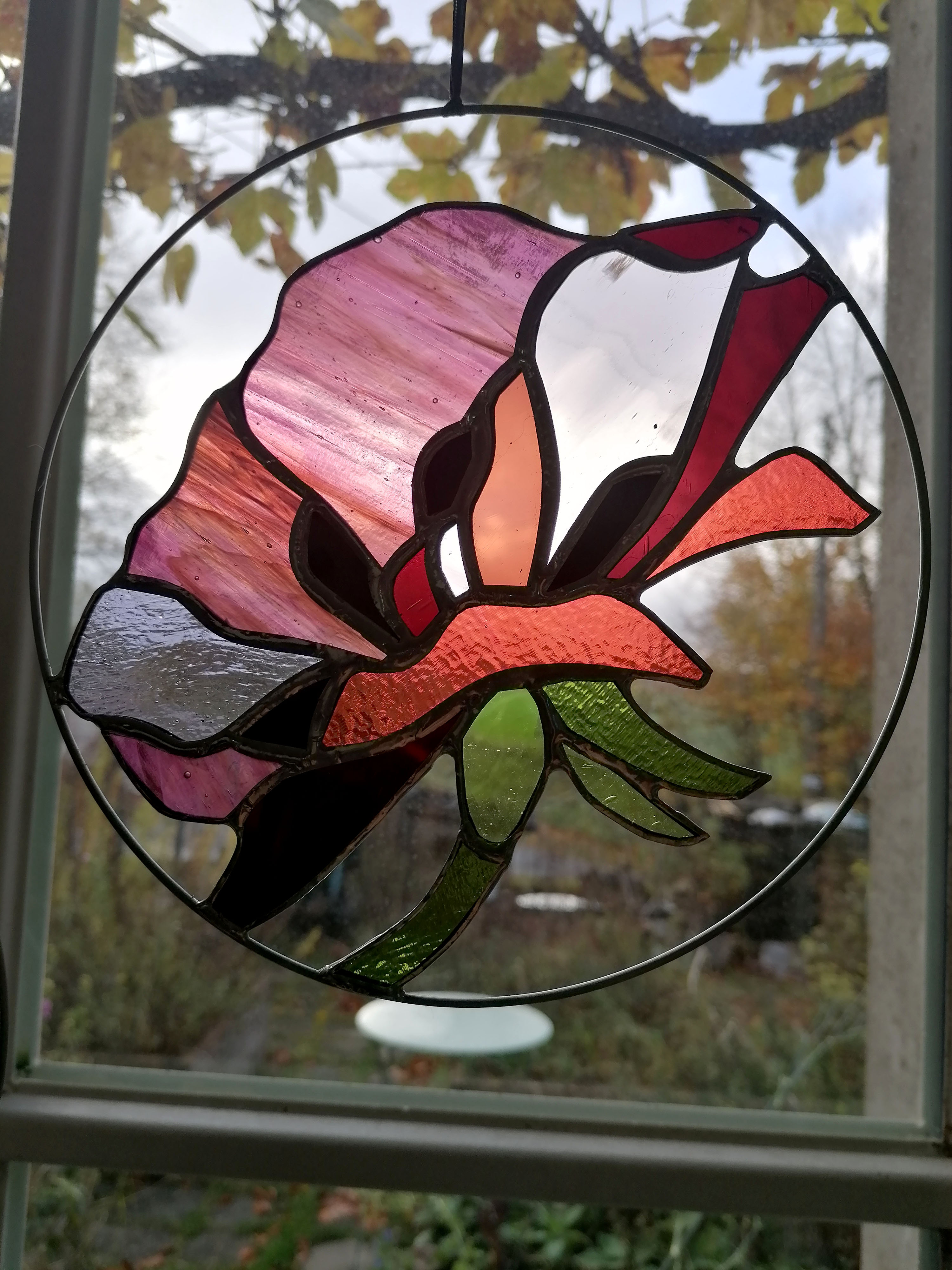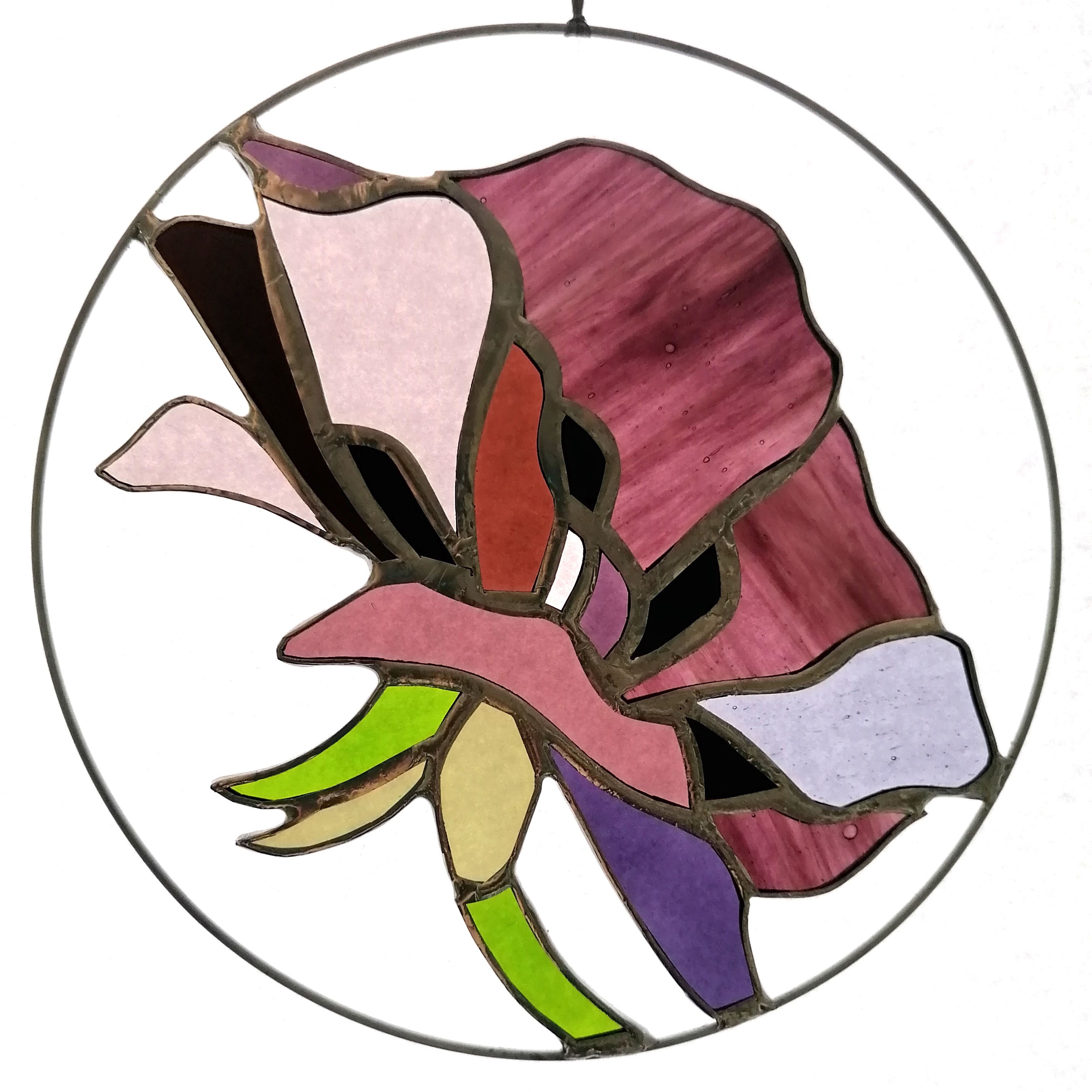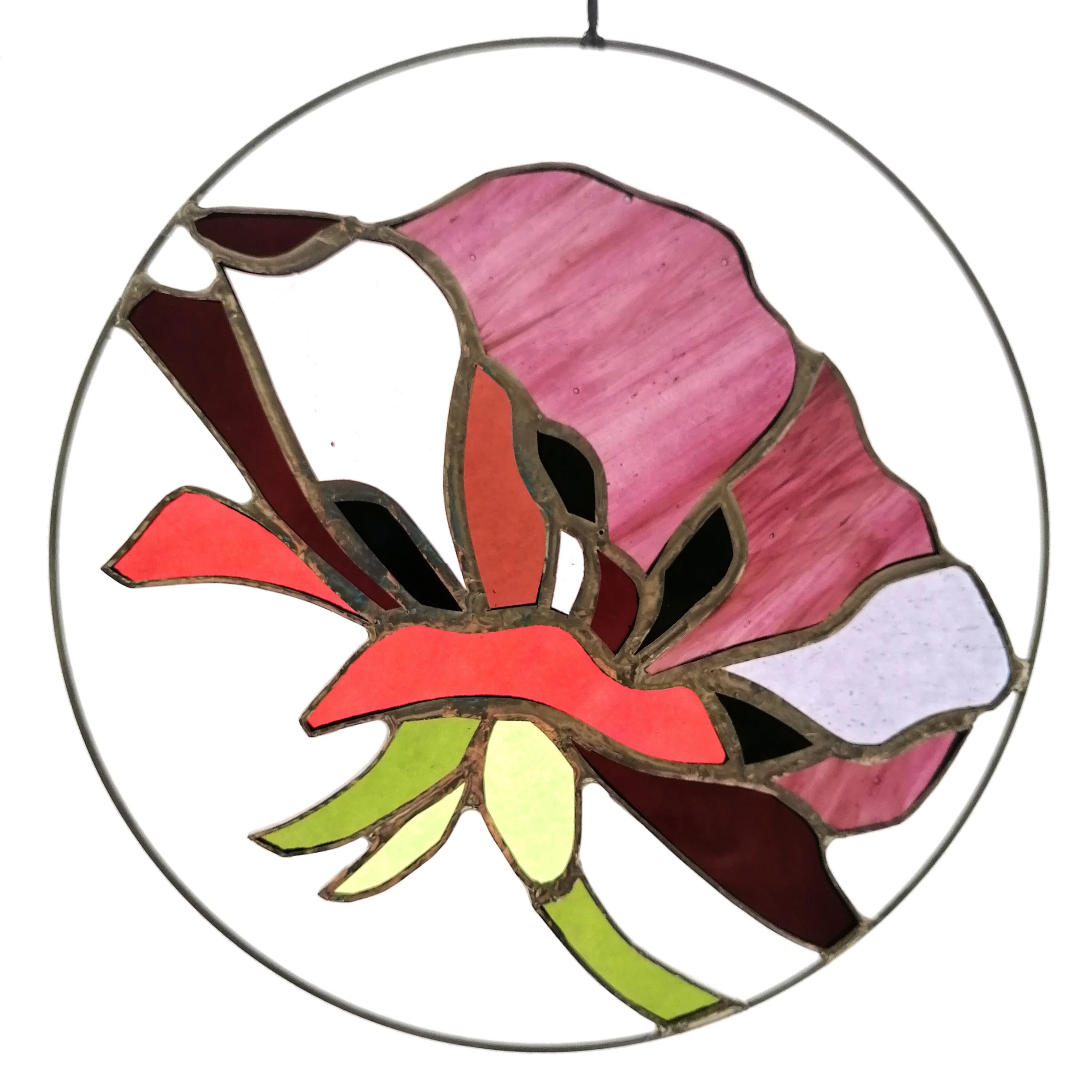 Médaillon à suspendre en verre ajouré de 20cm de diamètre, représentant une fleur de pavot dans des variations prune, bordeaux, rose et corail.