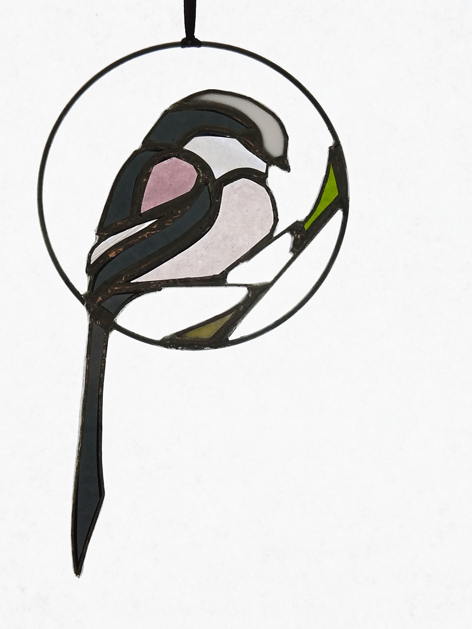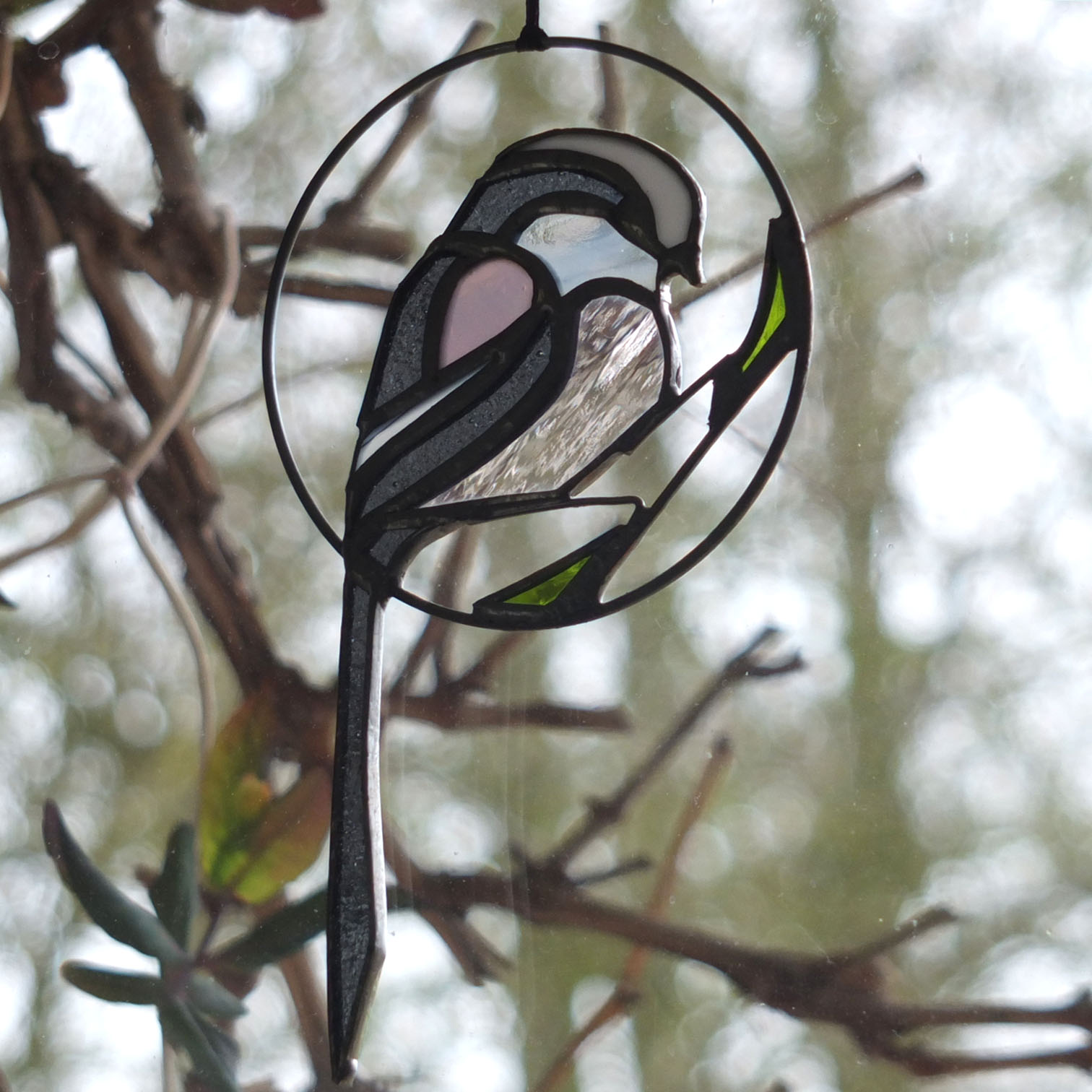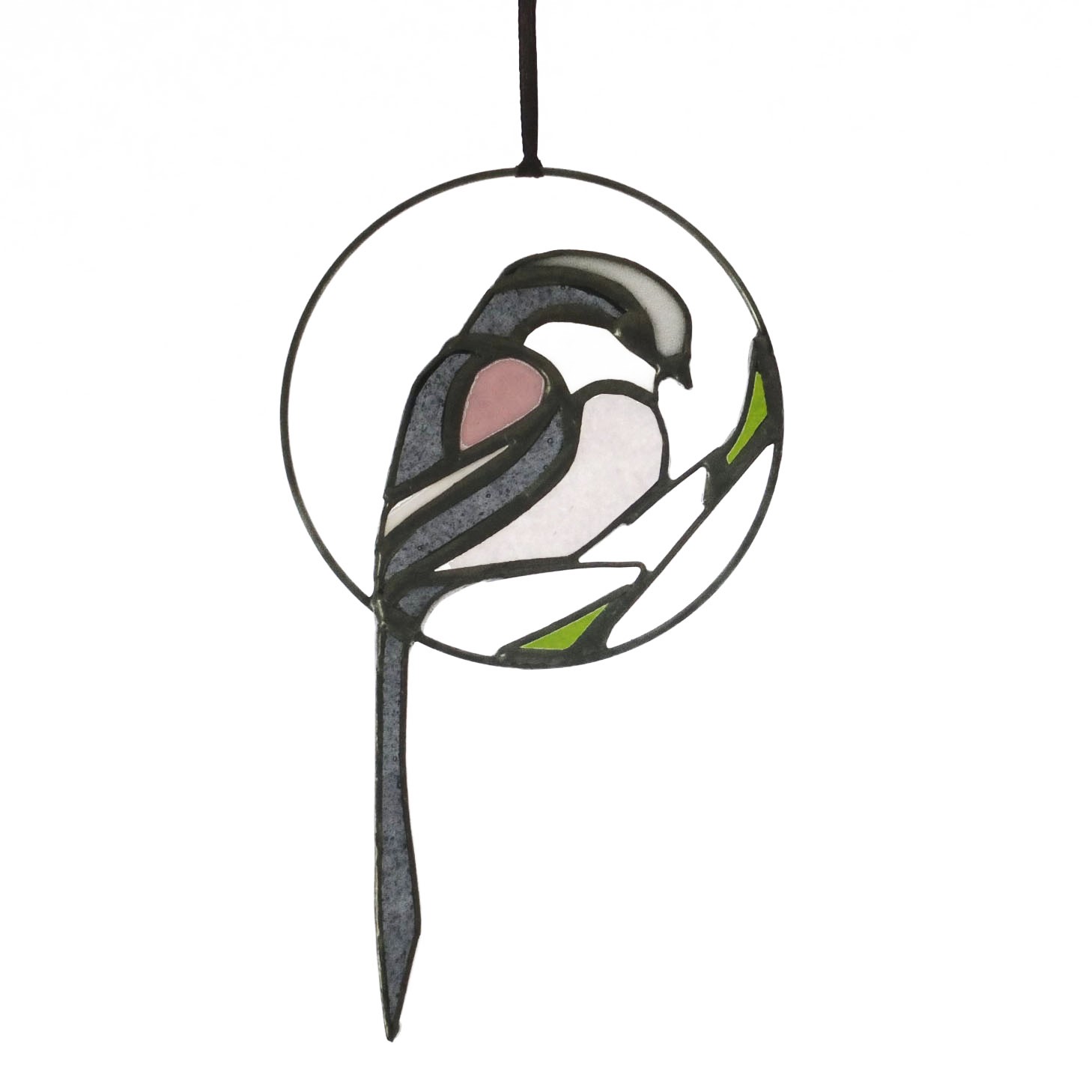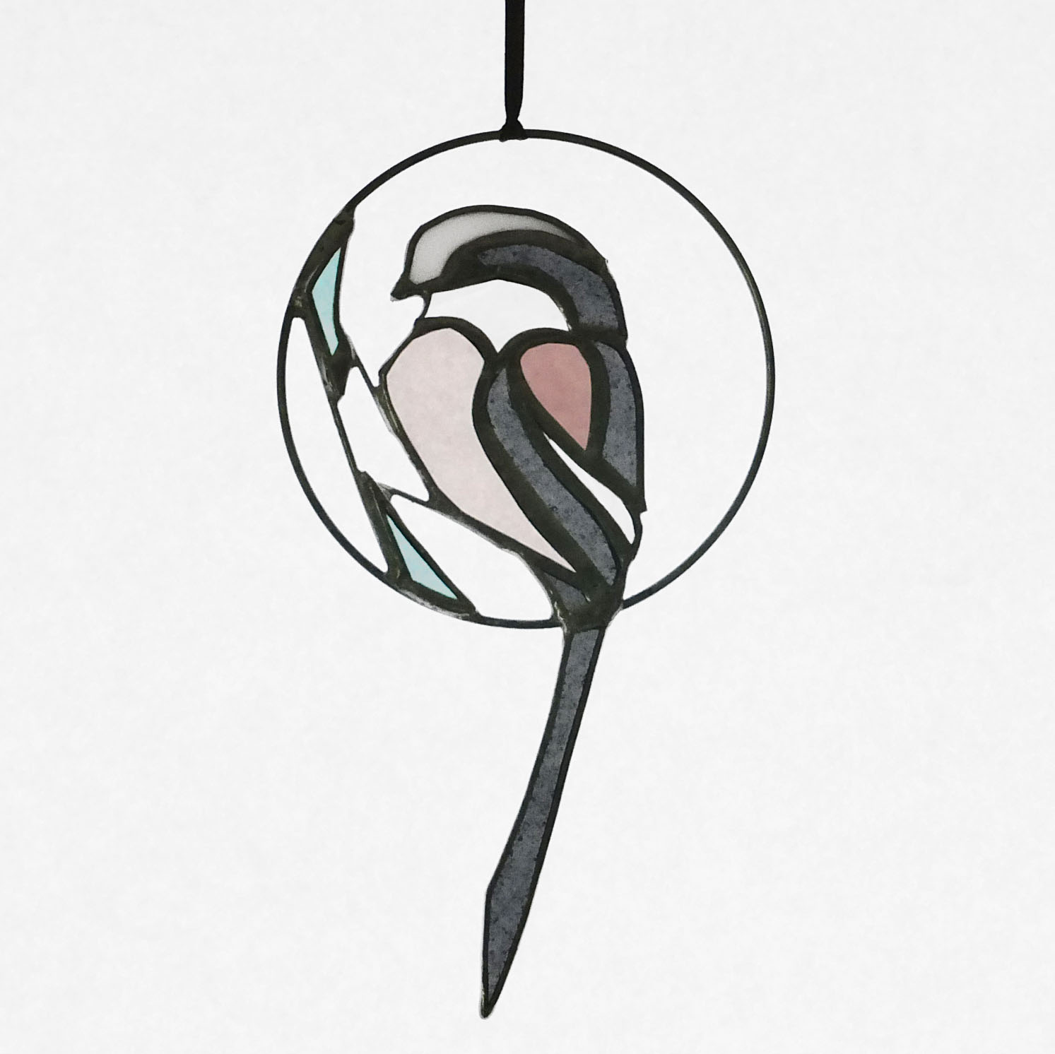 Médaillon à suspendre en verre ajouré de 10cm de diamètre (17cm avec la queue), représentant une orite à longue queue (appelée anciennement mésange à longue queue ;), dans des tons gris foncé, rose et blanc.
