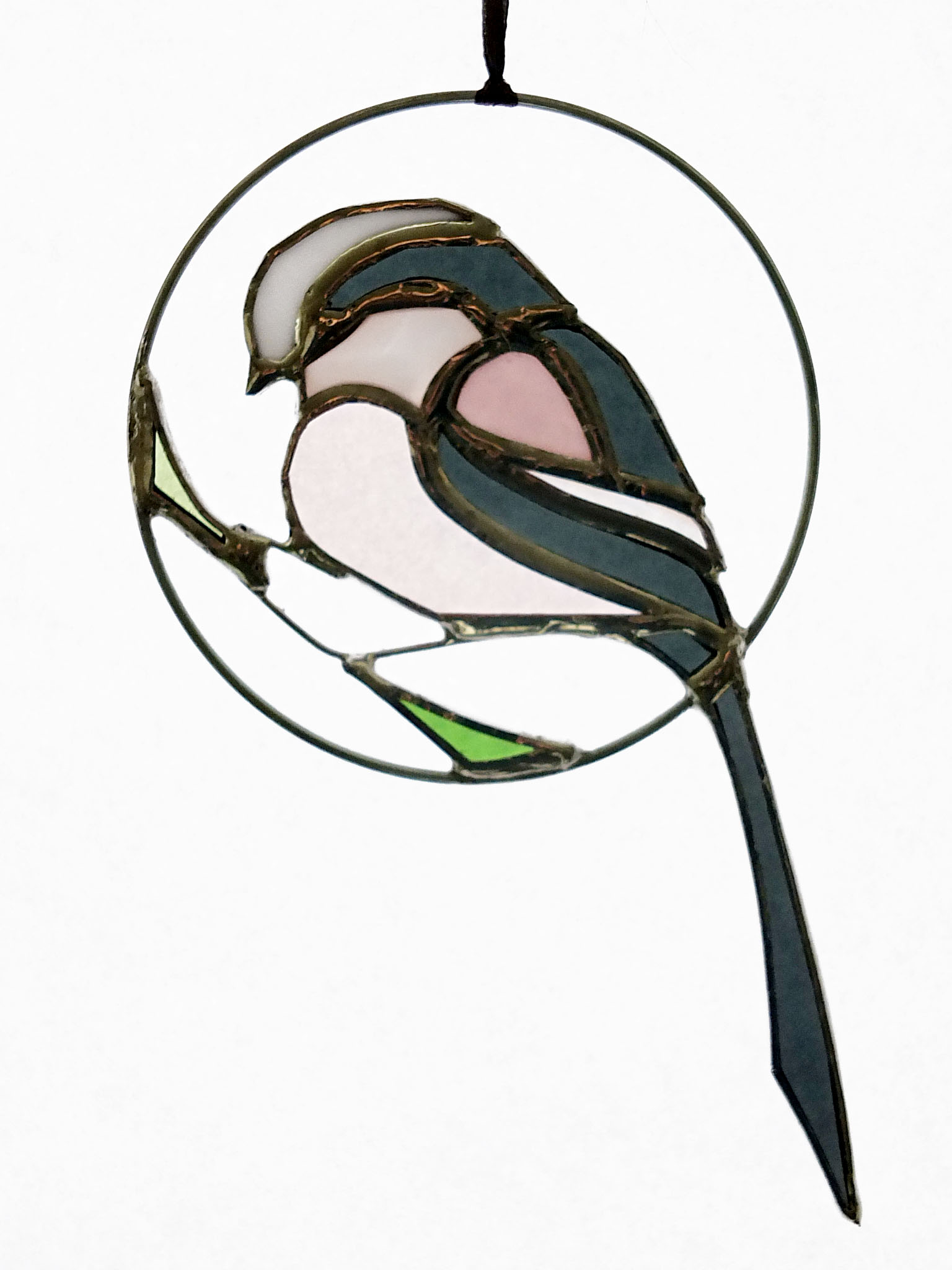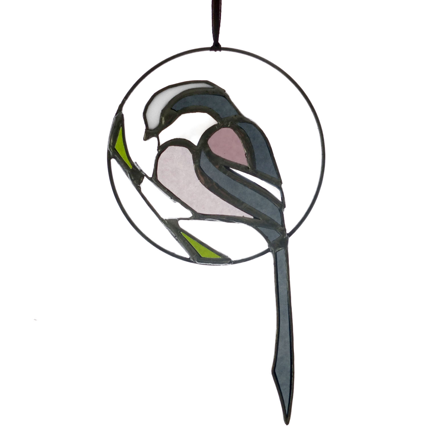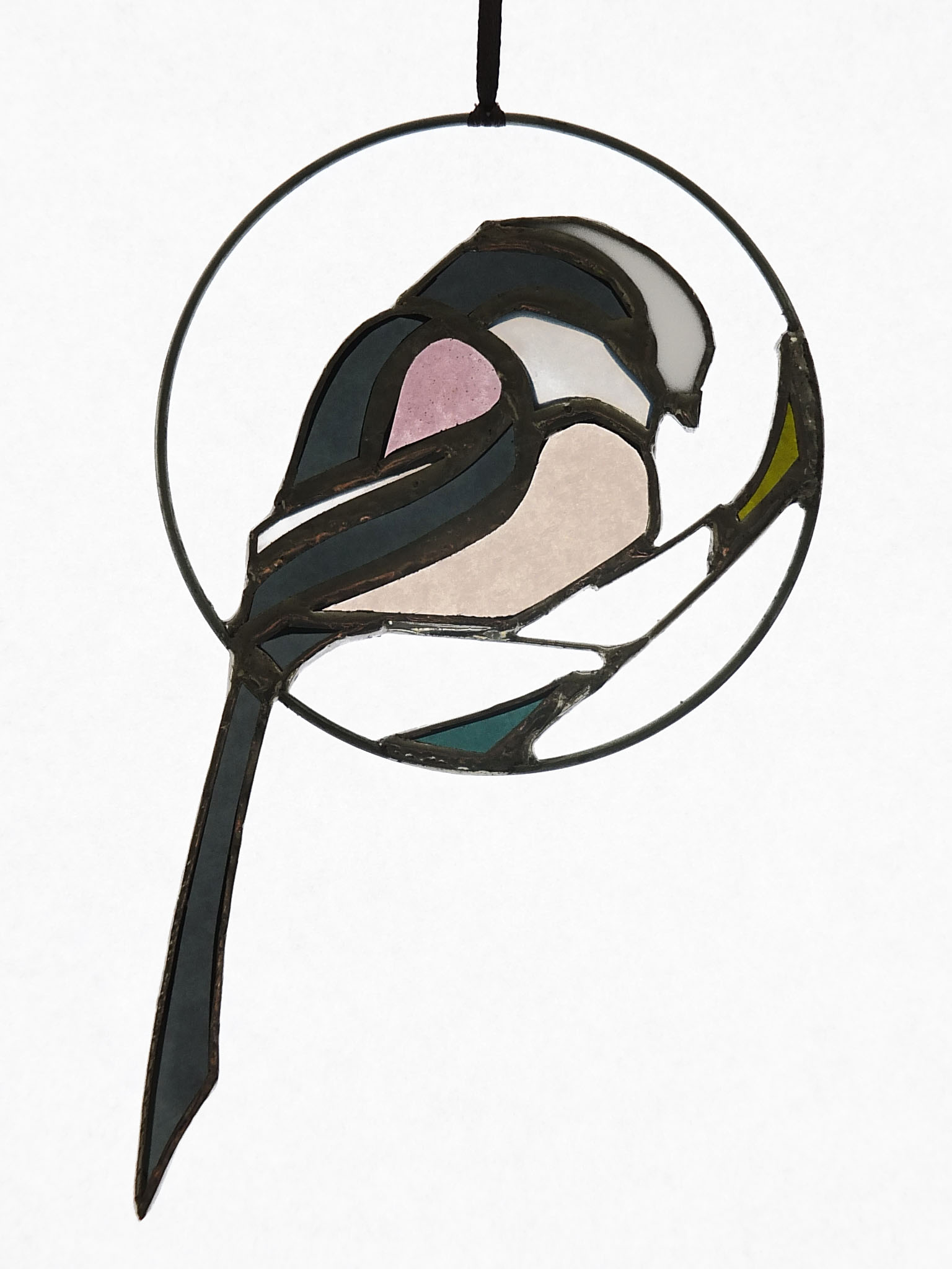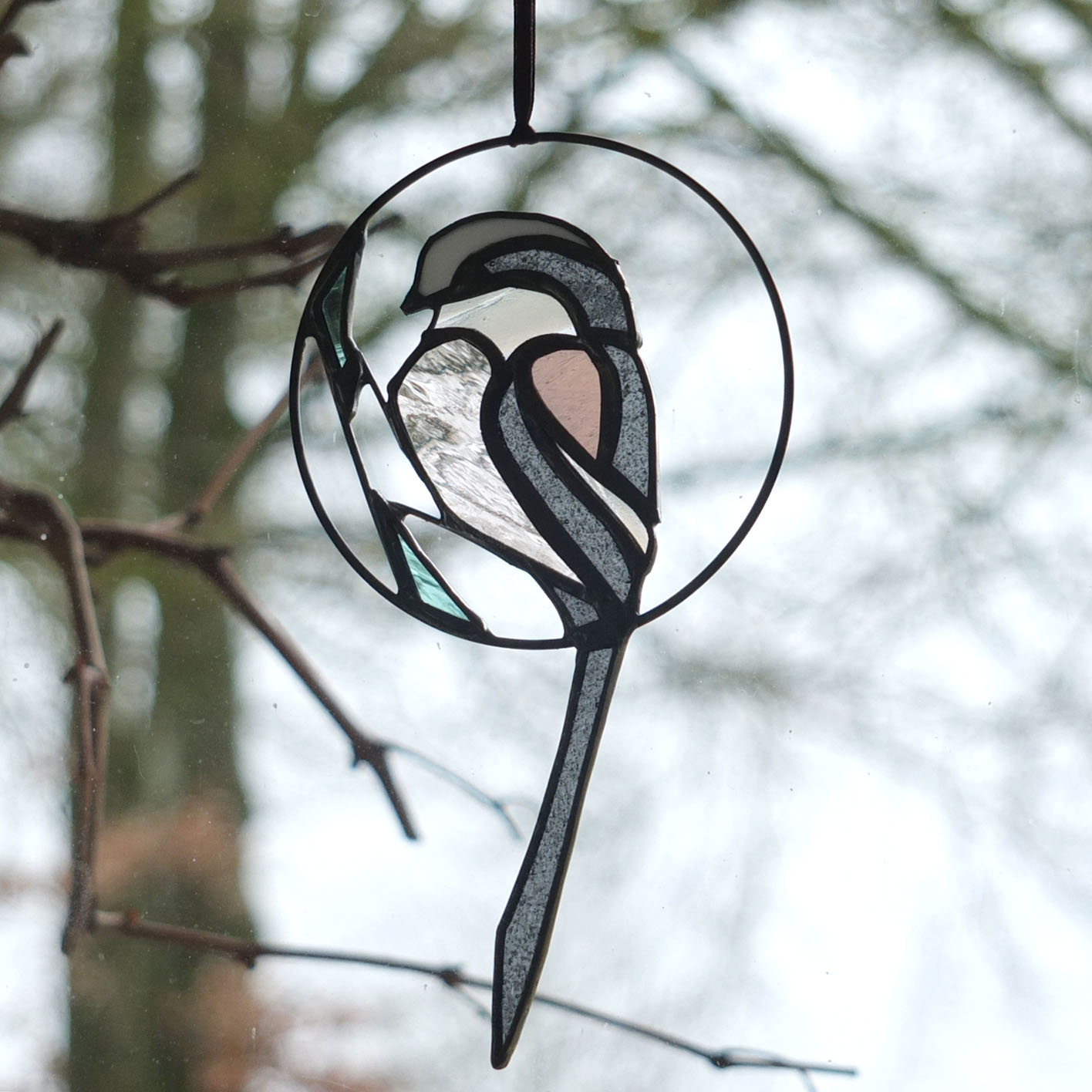 Médaillon à suspendre en verre ajouré de 10cm de diamètre (17cm avec la queue), représentant une orite à longue queue (appelée anciennement mésange à longue queue ;), dans des tons gris foncé, rose et blanc.