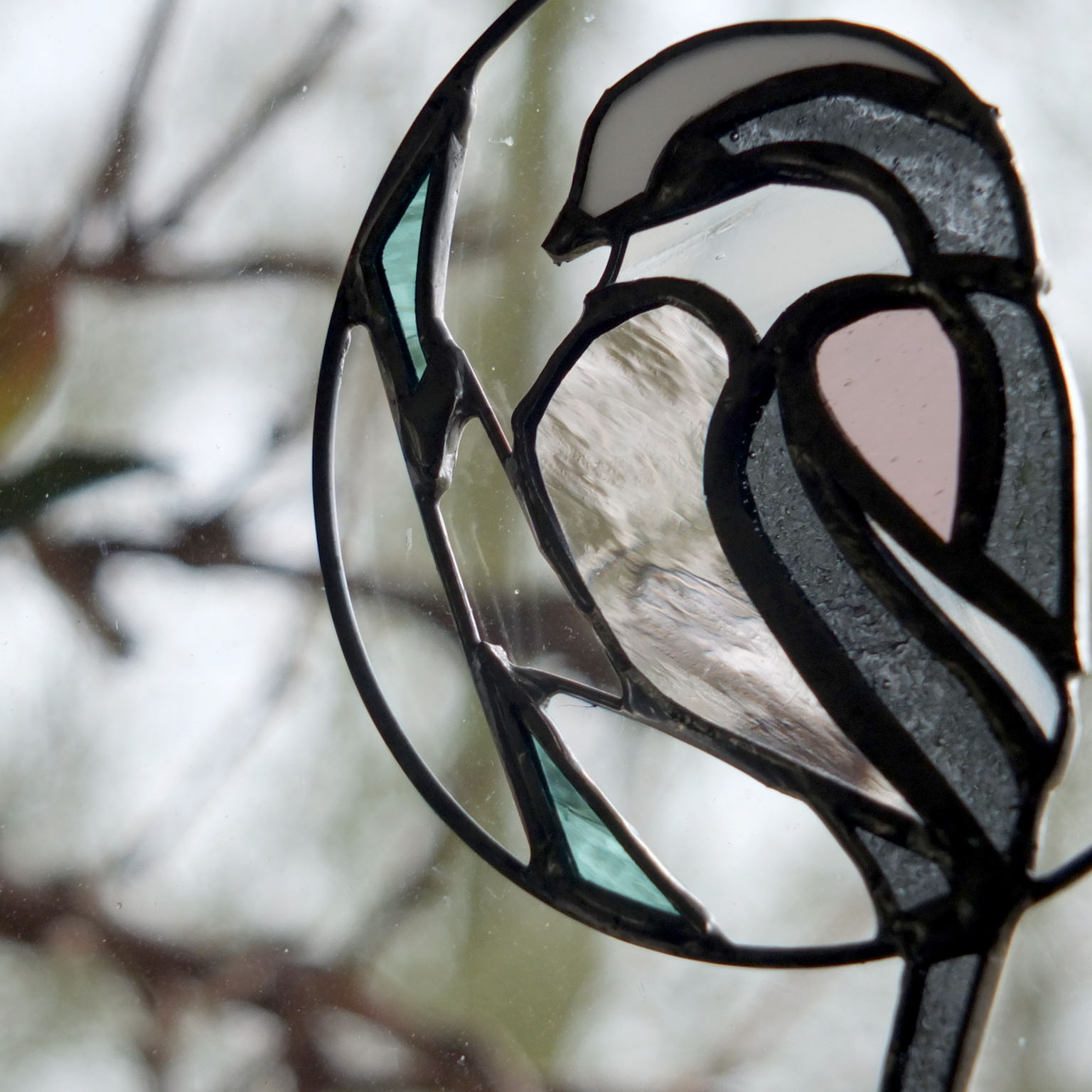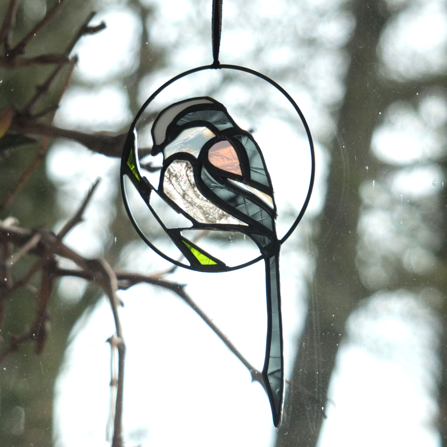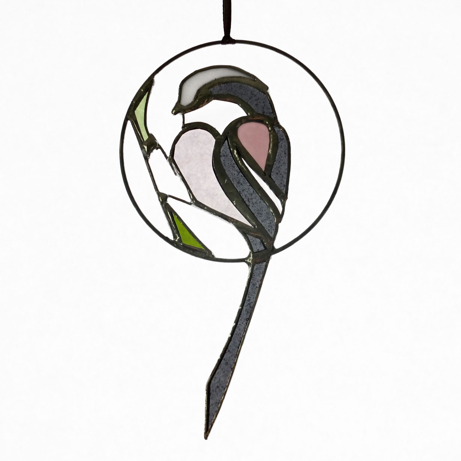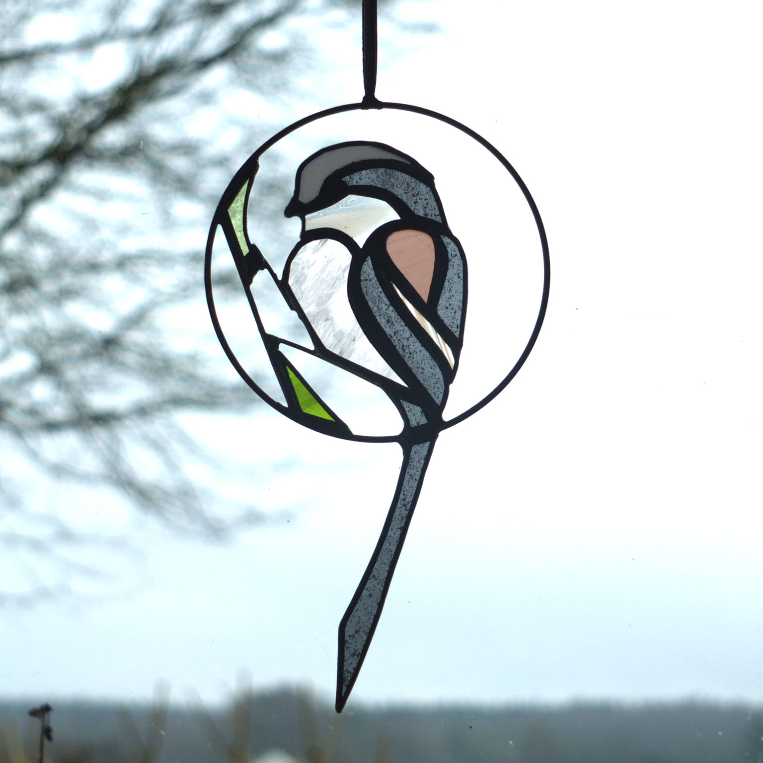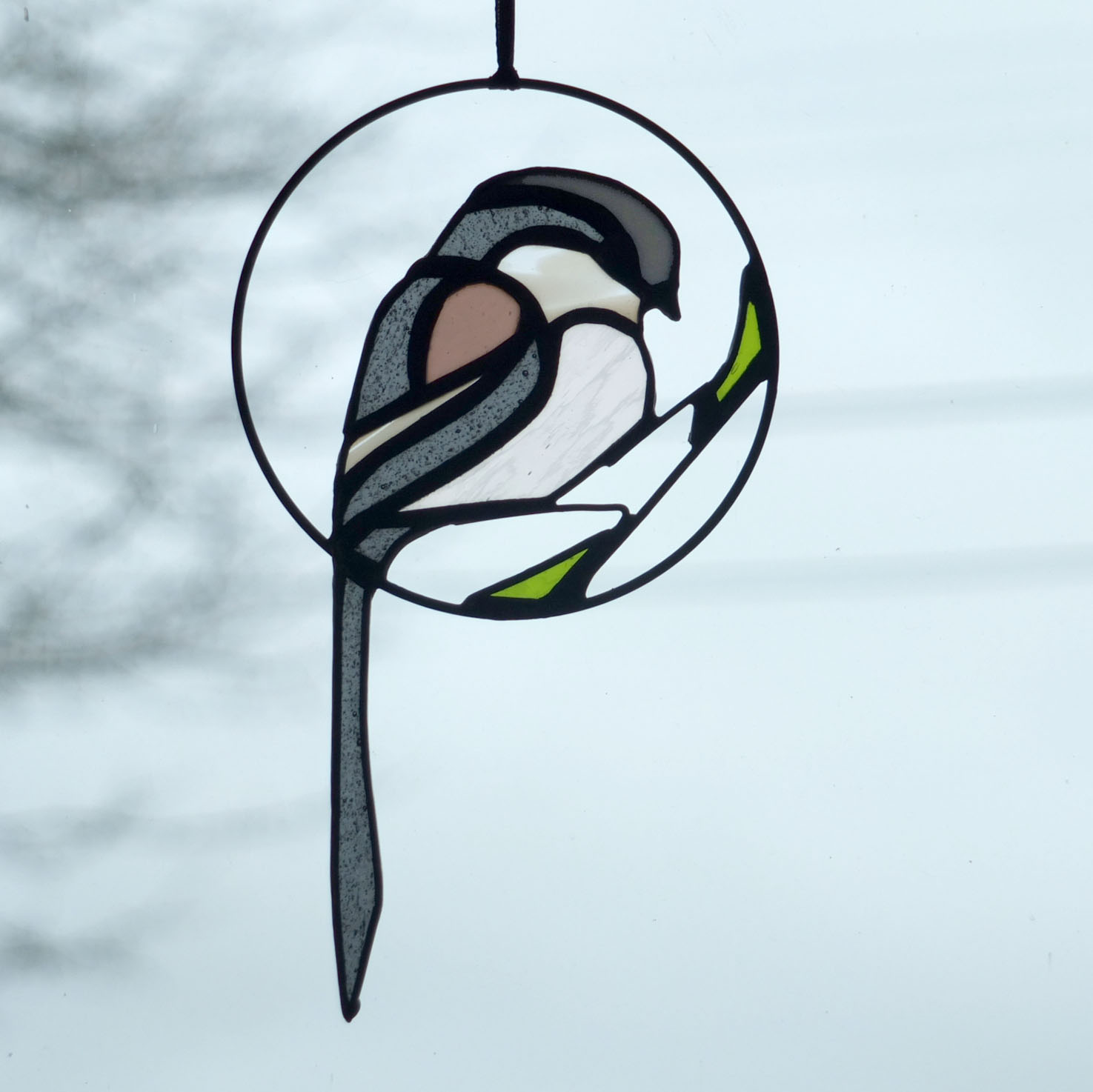 Médaillon à suspendre en verre ajouré de 10cm de diamètre (17cm avec la queue), représentant une orite à longue queue (appelée anciennement mésange à longue queue ;), dans des tons gris foncé, rose et blanc.