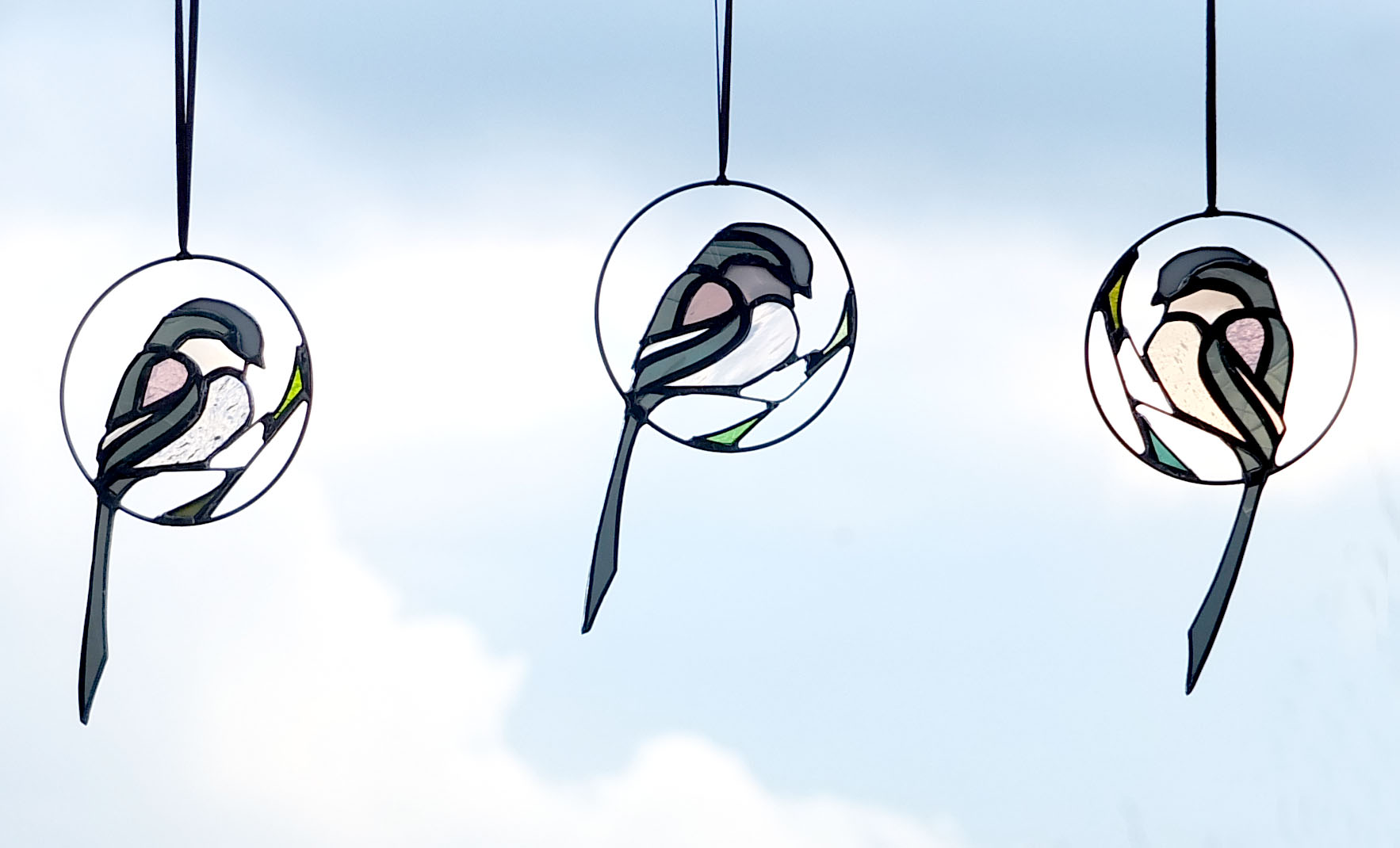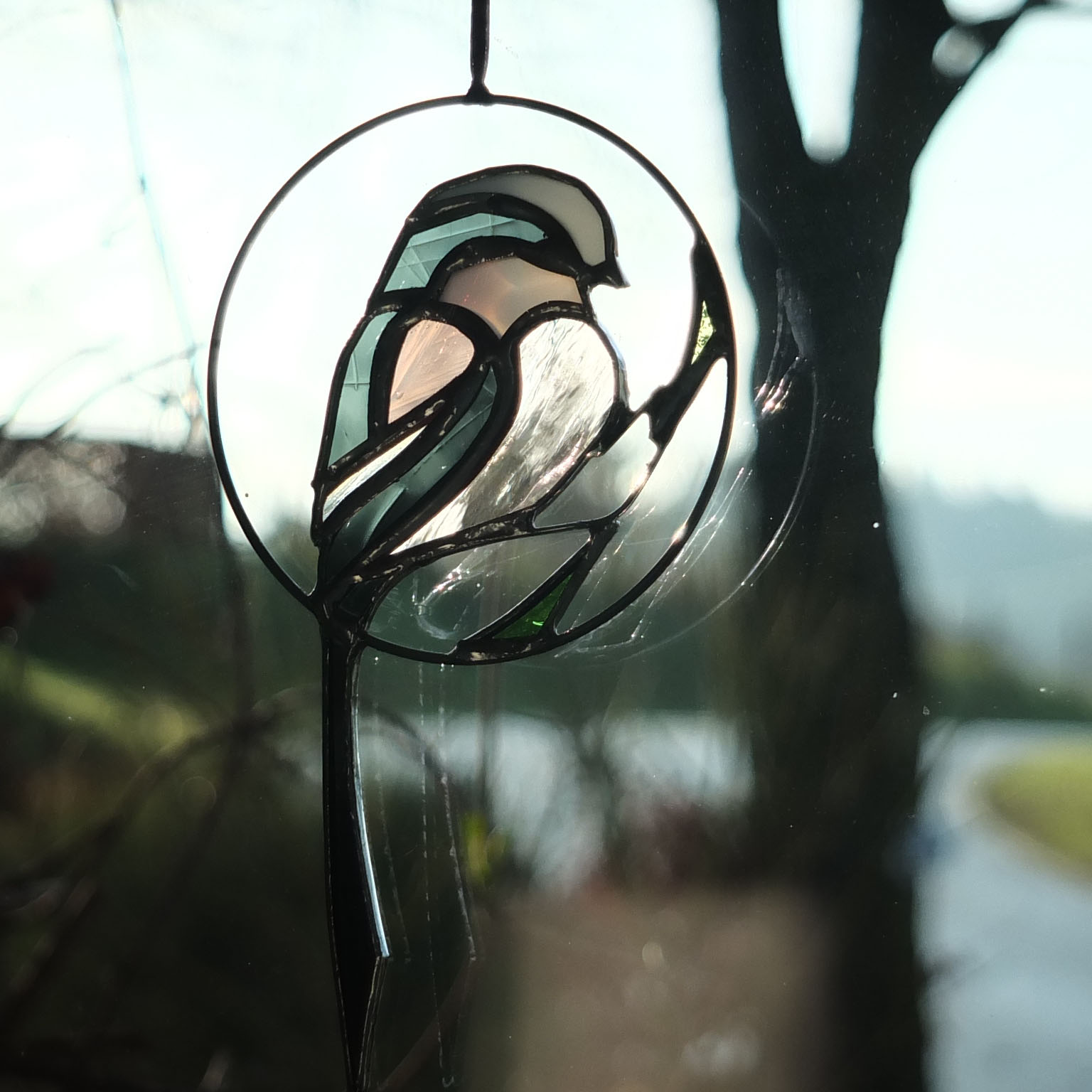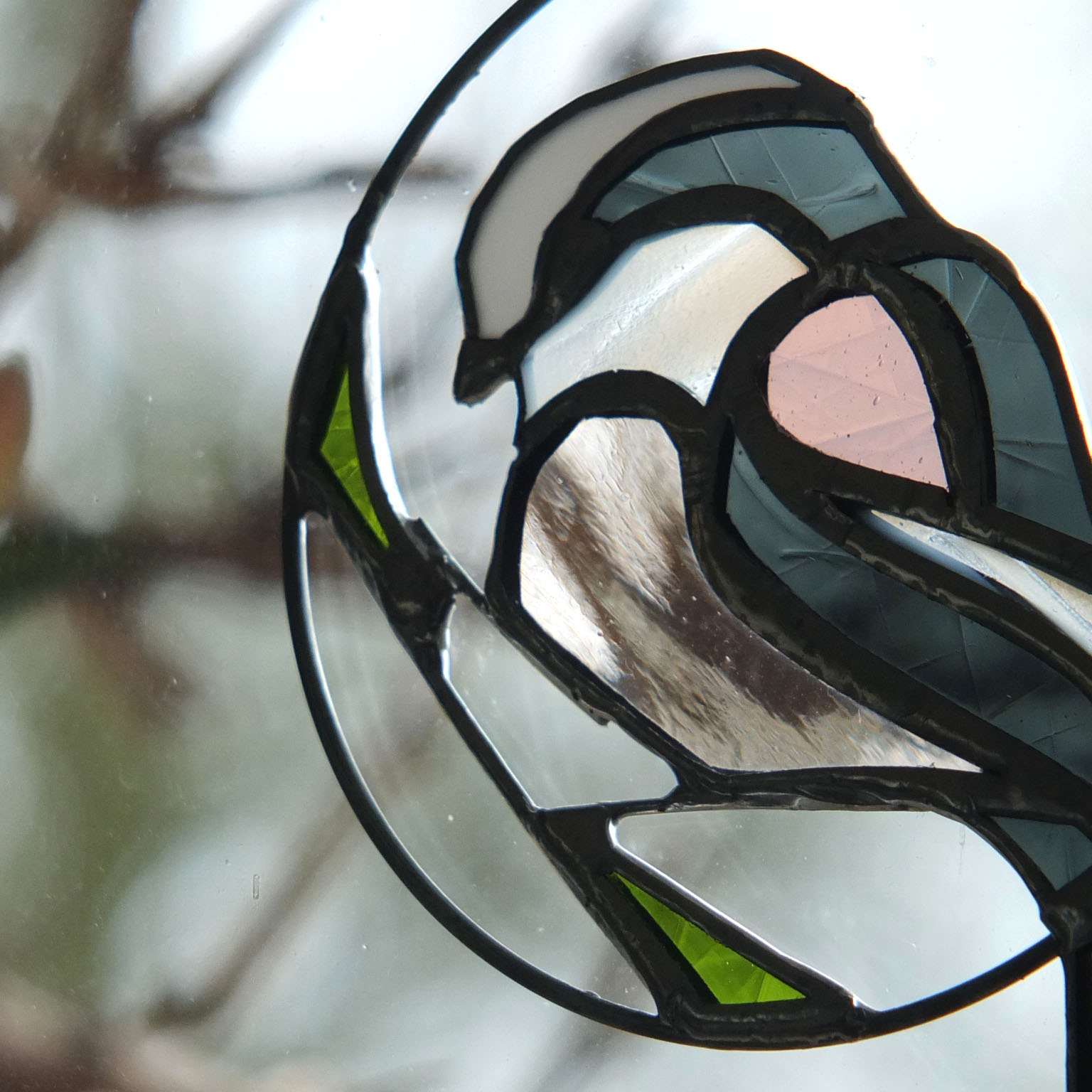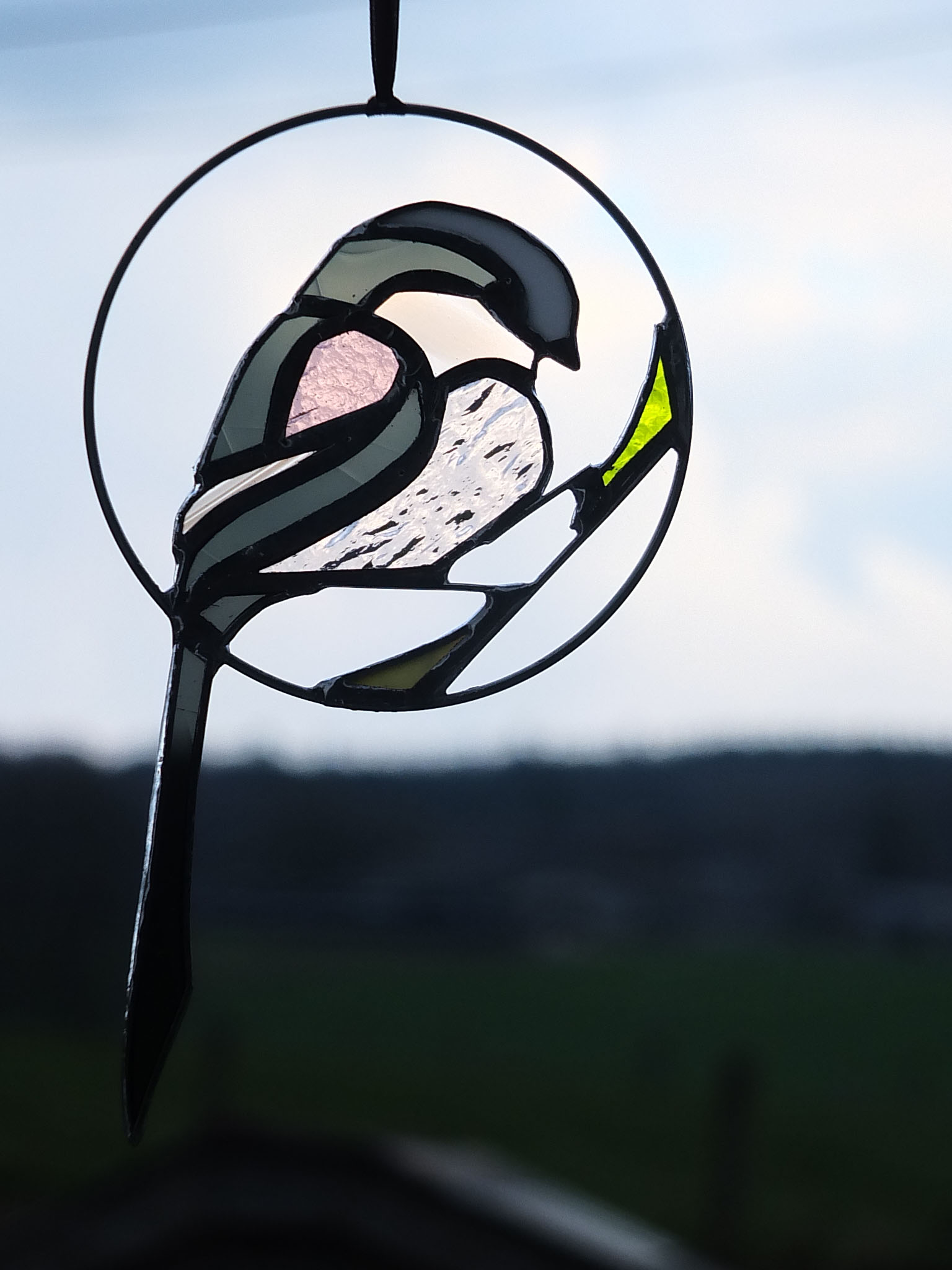 Médaillon à suspendre en verre ajouré de 10cm de diamètre (17cm avec la queue), représentant une orite à longue queue (appelée anciennement mésange à longue queue ;), dans des tons gris foncé, rose et blanc.